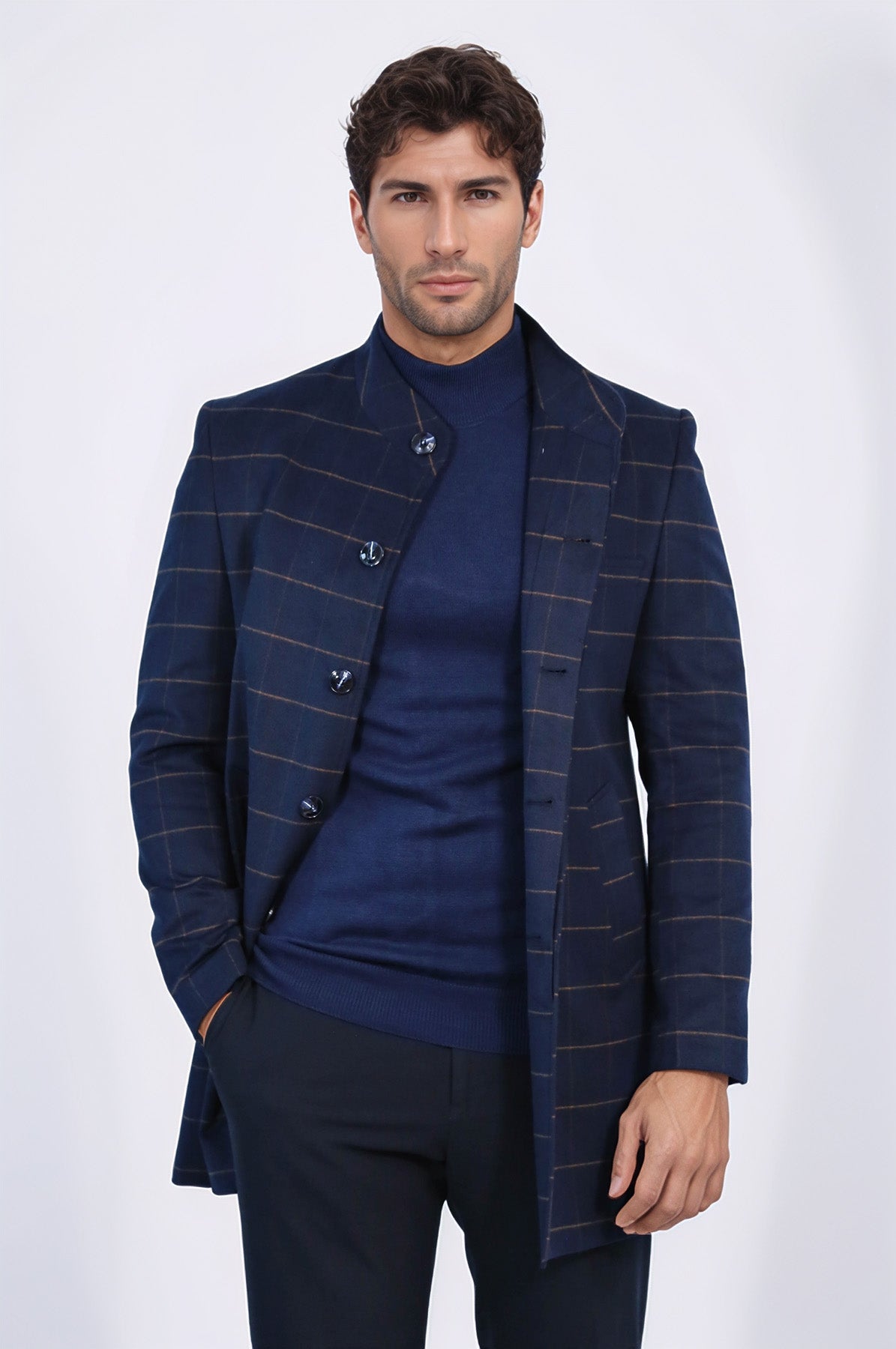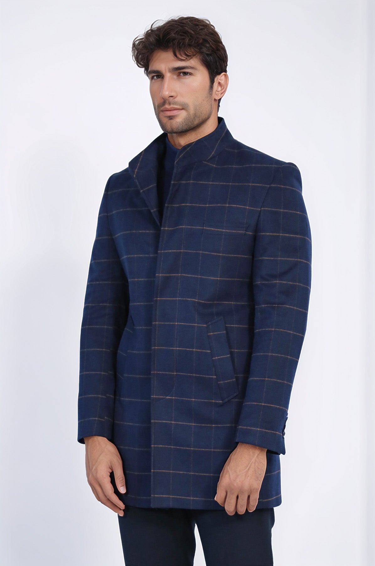 منقوشة الوقوف طوق معطف الرجال الأزرق الداكن - ويسي