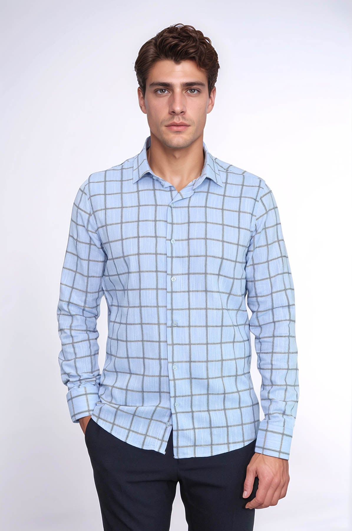 A: The modern blue checkered pattern offers a smart yet casual look, making it versatile for both office and casual wear.