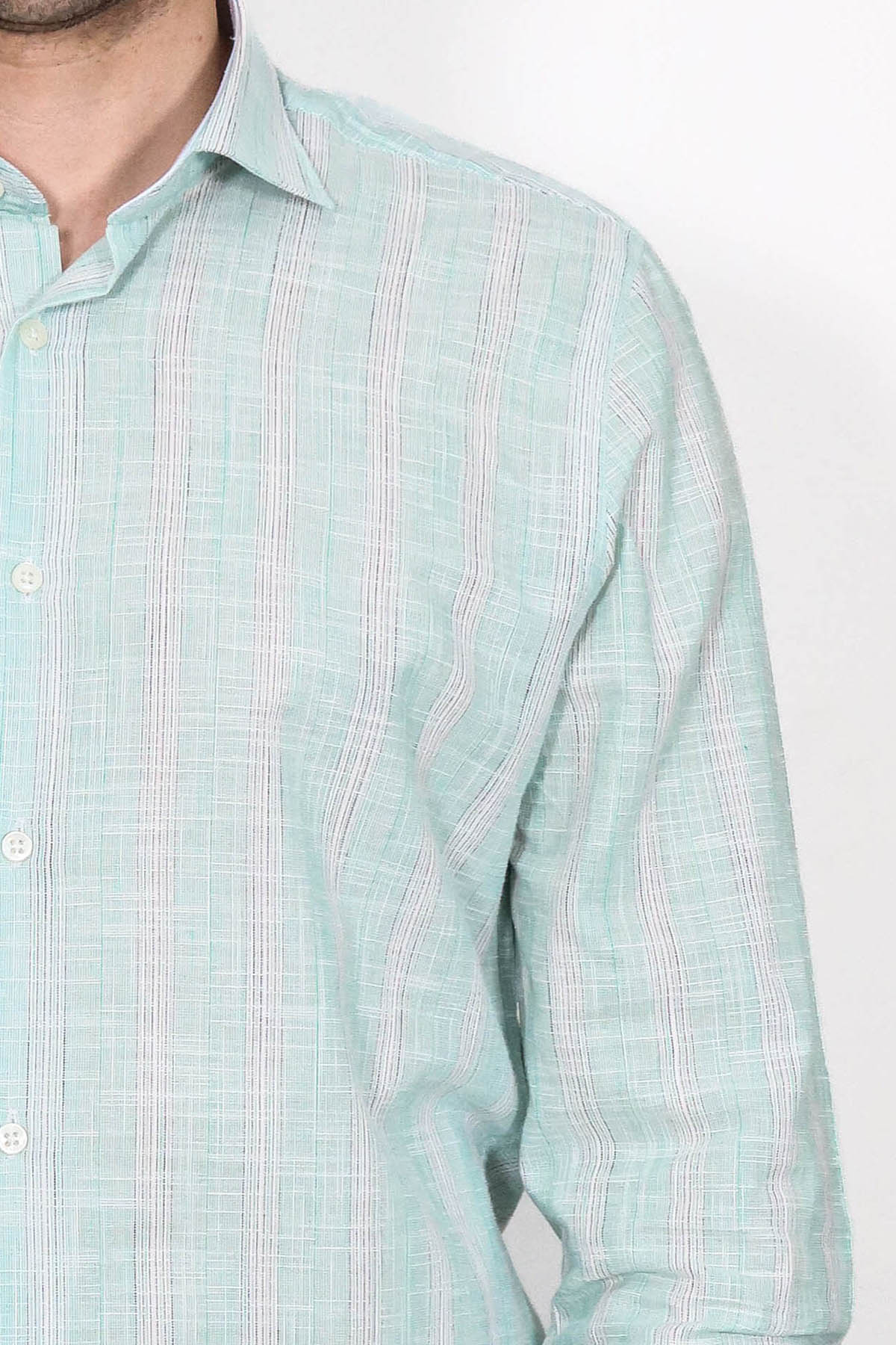 نموذج القميص الرجالي هذا، المصمم من قماش أخضر مائي تم إنتاجه بالكامل باستخدام القطن، يبدو أنيقًا للغاية بنمطه المنقوش. لا يحتوي هذا القميص على جيب وتفاصيل زر الياقة. هذا القميص، الرياضي والأنيق، مناسب جدًا للاستخدام اليومي في فصلي الربيع والصيف. سيبدو جيدًا جدًا على جسمك مع قالب نحيف وقص ضيق. سيجعلك هذا القميص ذو الأكمام الطويلة تبدو أنيقة وعصرية أينما ترتديه.