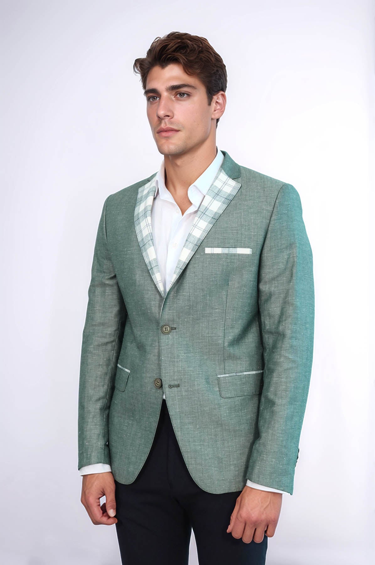 التفاصيل: أزرار مزدوجة، ياقة مدببة، 6 قطرات، فتحة تهوية واحدة، جيب وياقة منقوشة