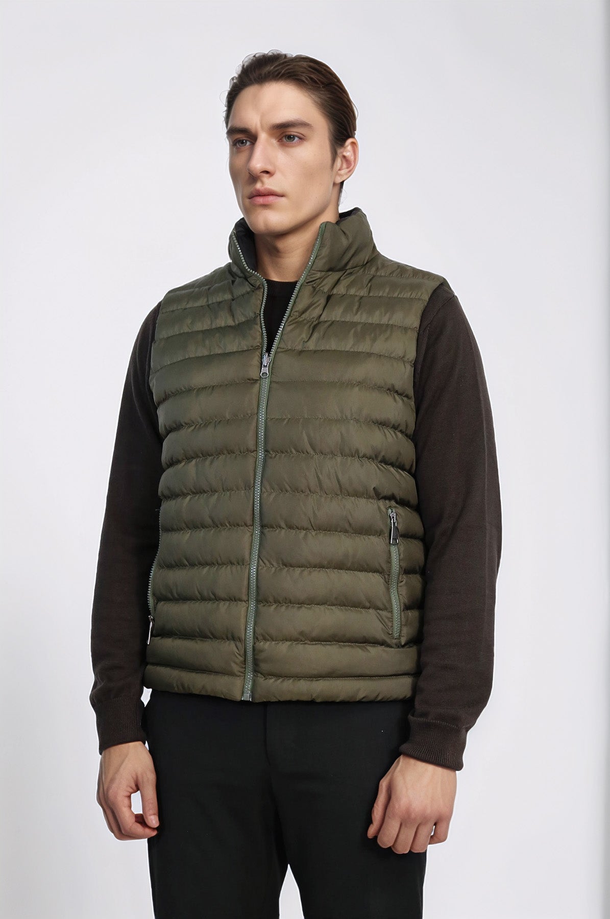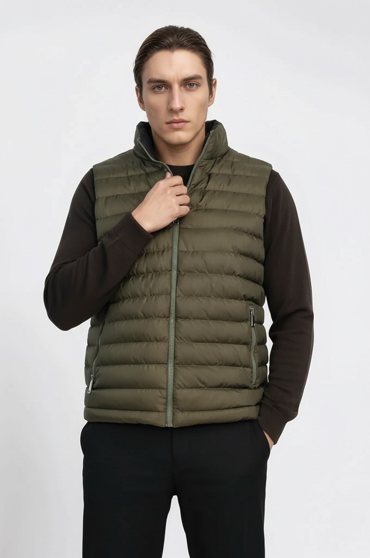 If you want to stay warm and look stylish on cold winter days, meet the green men's winter vest, a candidate to be an indispensable part of your wardrobe. This vest keeps you warm with its two pockets, zipper, stand-up collar and quilted seams, while adding a different dimension to your style with its reversible design. To create a sporty-chic outfit, you can base it on your green vest. Wear a dark sweater or knitwear in contrast with the vivid green color of the vest. Add a sport shirt or t-shirt with a relaxed fit to emphasize comfort. You can choose a pair of jeans or chinos with a relaxed fit underneath. Complete your outfit by matching the color of these pants with the vest. Combine elegance and comfort by wearing white sneakers on your feet. As a finishing touch, you can add accessories like wristbands or a sports hat to personalize your style. The green men's winter vest is the perfect option for those who want to achieve sporty chic. Keeping you warm and highlighting your style, this vest will be one of your favorite pieces in winter.