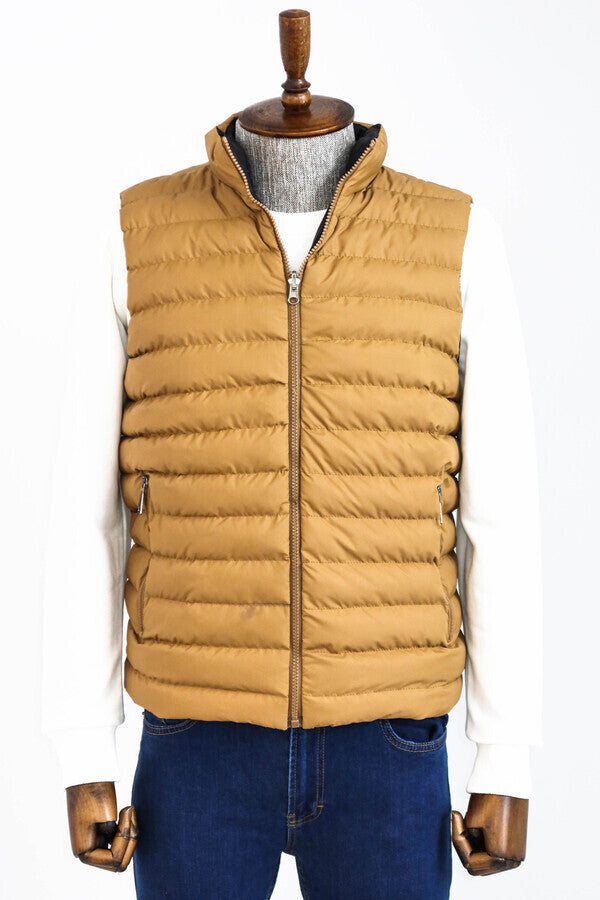Winter vests are a warm and comfortable piece of clothing that also offers freedom of movement. These vests are the perfect option for layering and are ideal for those who lead an active lifestyle outdoors in winter. The key to a classic and stylish style, this yellow men's winter vest features two pockets, a zipper fastening, a stand-up collar and quilted stitching. It is also a versatile product with its two-sided feature. It is ideal for sporty and stylish outfits while keeping you warm and stylish in cold weather conditions. You can combine this yellow winter vest with a white knit sweater and dark slim-fit jeans for a sporty chic look. You can complete the outfit by wearing a light colored jacket or blazer over it. Emphasize your style with white leather sneakers or brown leather boots. Additionally, you can add accessories such as wristbands or a sports watch to complete your look. This outfit is perfect for a stroll around the city, meeting friends or a chic dinner.