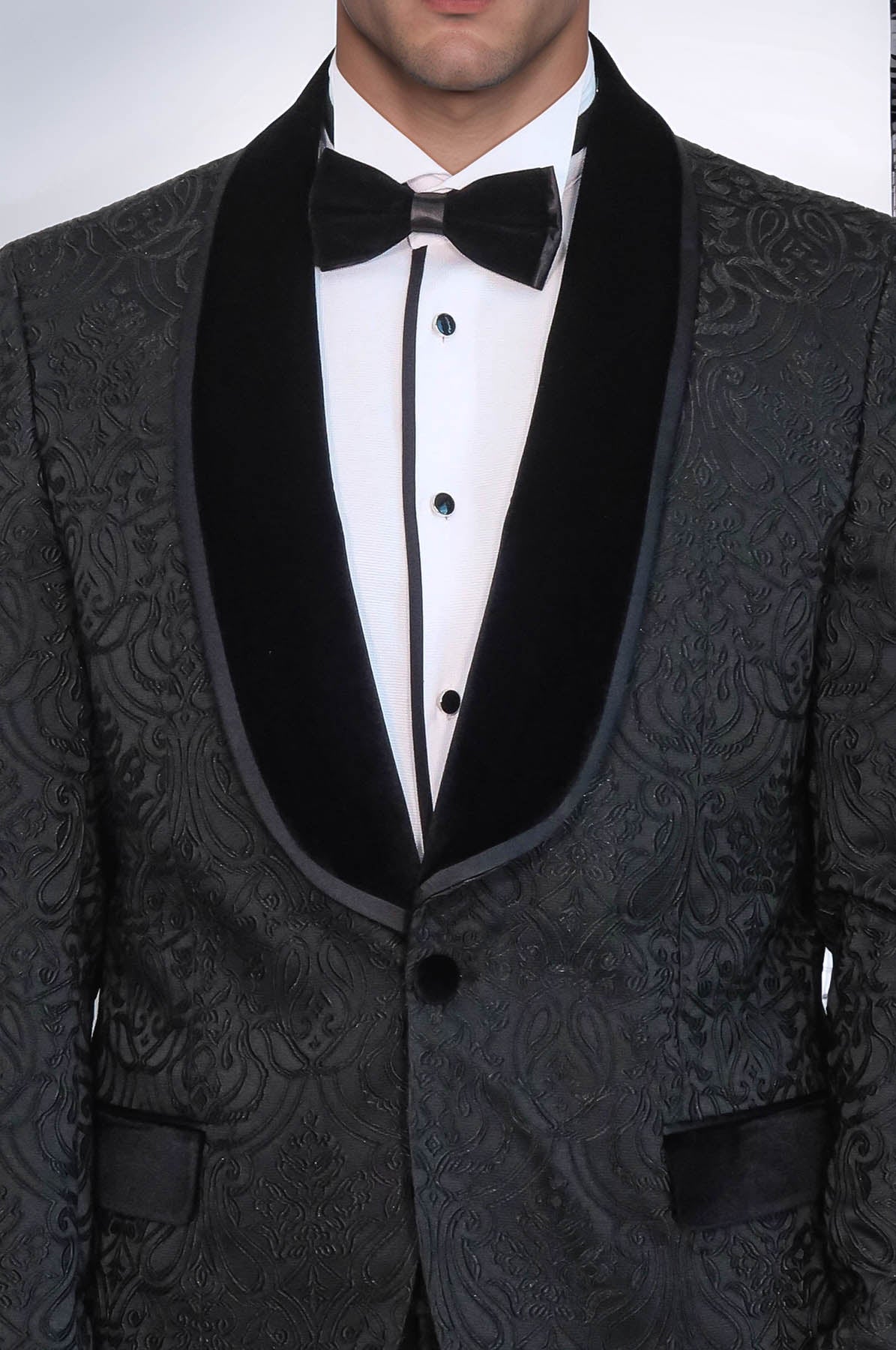 Elevate your style with our 2 piece damask patterned velvet shawl collar black men's tuxedo suit from Wessi. Made with high-quality fabric, this suit exudes luxury and sophistication. Perfect for any formal event, it will make you stand out from the crowd with its unique design and impeccable fit.