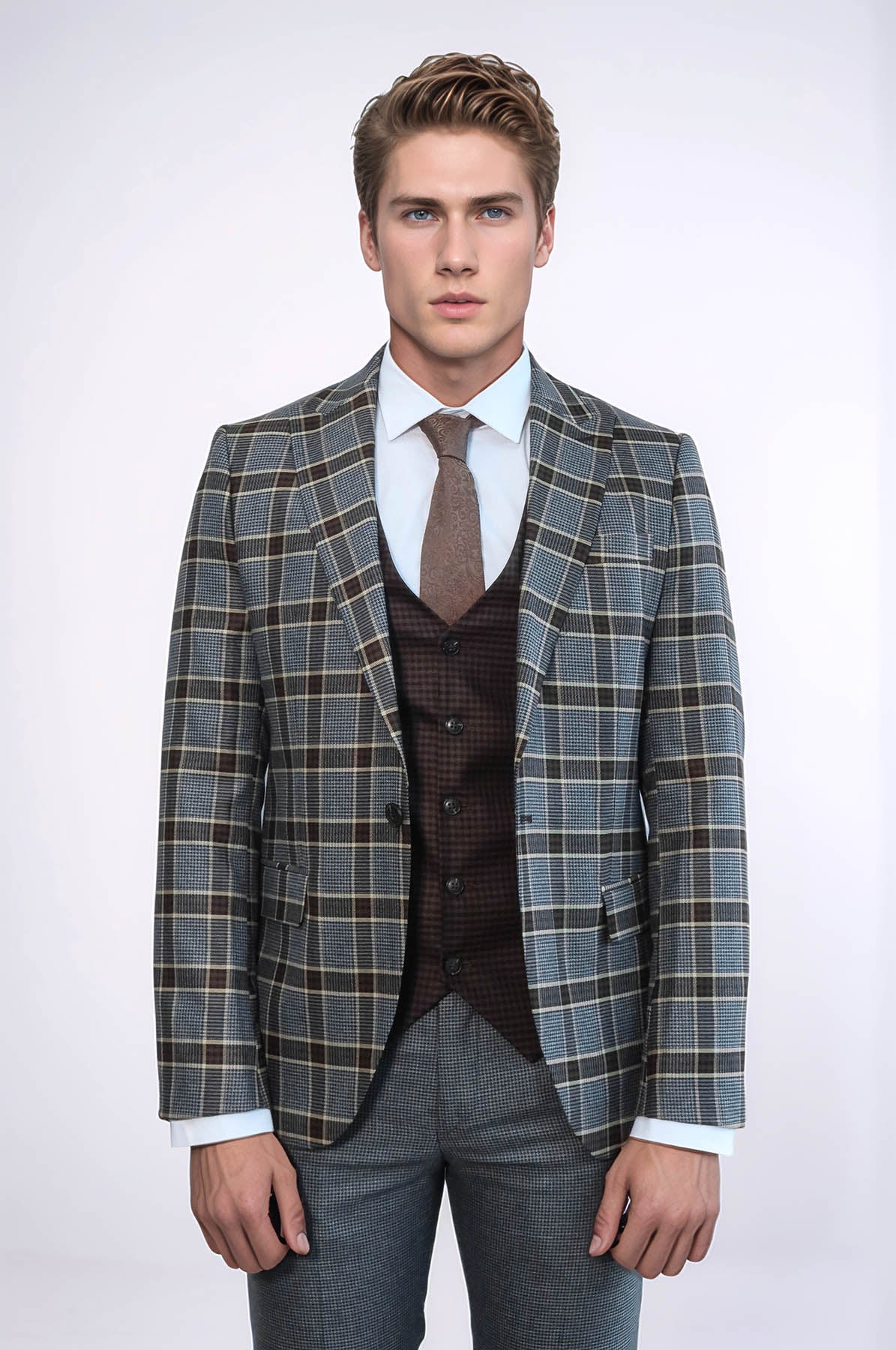Gentlemen, if you're looking for a versatile suit that's perfect for both casual gatherings and formal events, then a grey and brown checked suit with a slim fit and peak lapel is the way to go. Not only is it on-trend, but it's also a confidence booster when you're wearing it. To complete your look, try pairing it with a solid-colored dress shirt Or you can also switch things up by wearing a turtleneck or a denim shirt underneath the jacket for a more casual look. Whether you're heading out for a date night or a team meeting at the office, this suit will have you looking sharp and stylish. It's perfect for both business casual and formal occasions, so you won't have to worry about changing your outfit when transitioning from one event to another. So, gents, embrace this men's fashion trend and add a grey and brown checked suit to your wardrobe today. It's the perfect way to elevate your daily look and turn heads at any event.