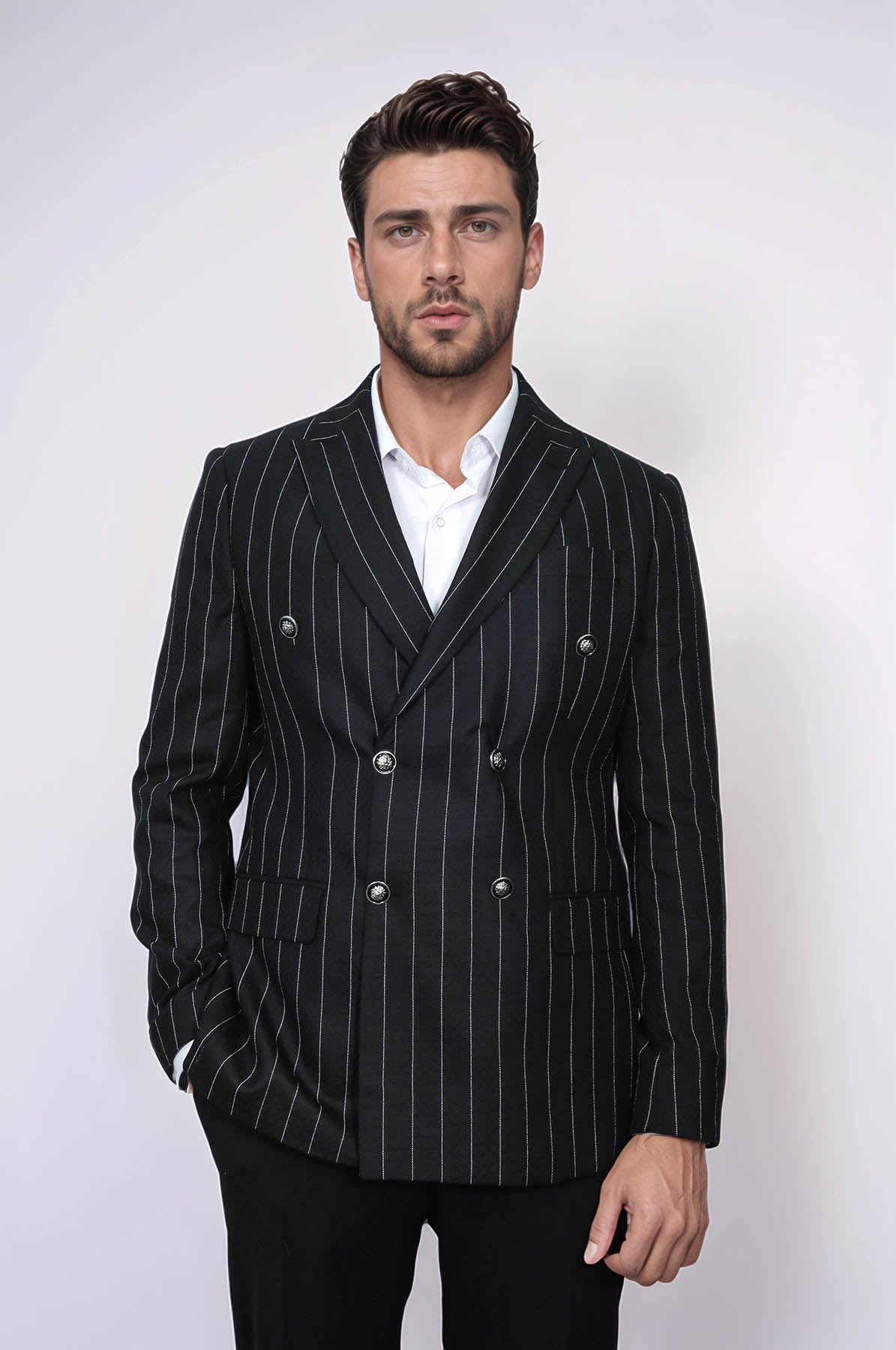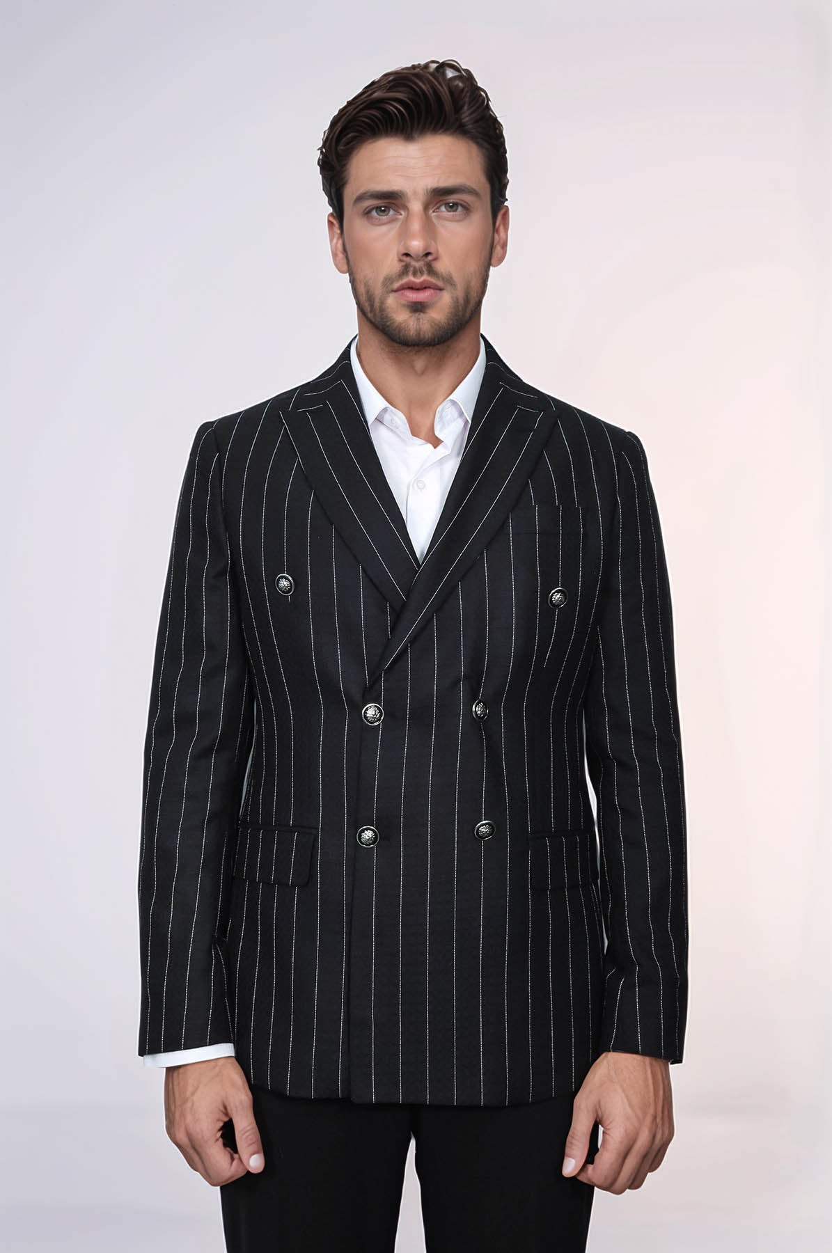 Double Breasted Slim Fit Striped Black Men Blazer - Wessi