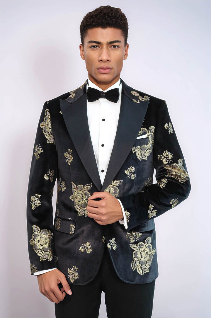 Gold Floral Patterned Shiny Black Men Prom Blazer - Wessi