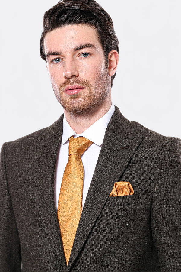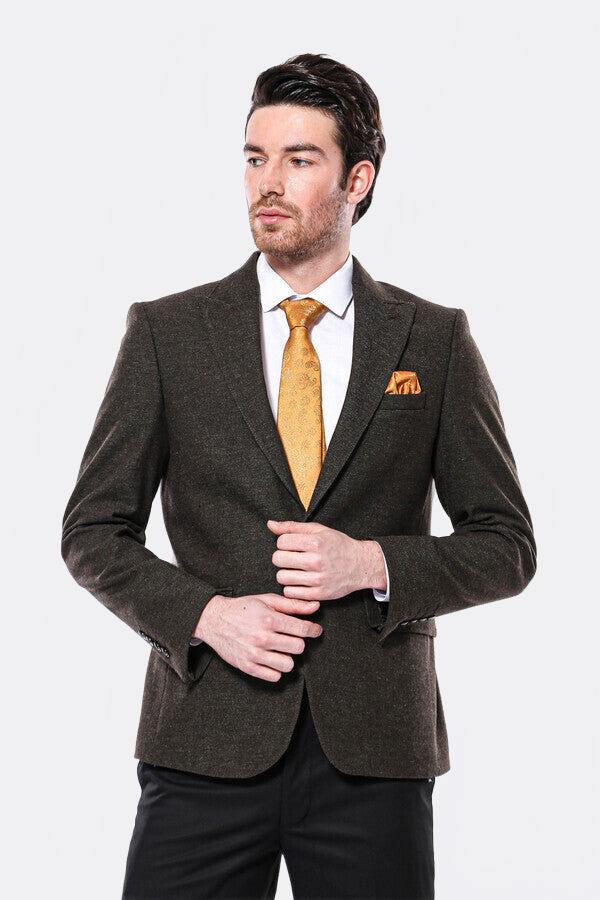 The khaki color single button peak lapel men's jacket model designed with winter fabric for your autumn and winter concepts is an ideal choice for your dark concepts. Since the color tone of the model is quite dark, stylish combinations can be obtained by choosing a light-colored tie like saffron color. You can complete your combinations with shoes in dark brown tones. The slim fit model fits your style perfectly with its double button and slit design. You can visit our website for the most stylish combinations in every season, and you can start shopping instantly with the most attractive priced product options. You can find all the products you are looking for in our categories where the most stylish and highest quality products are included in the campaign price ranges.