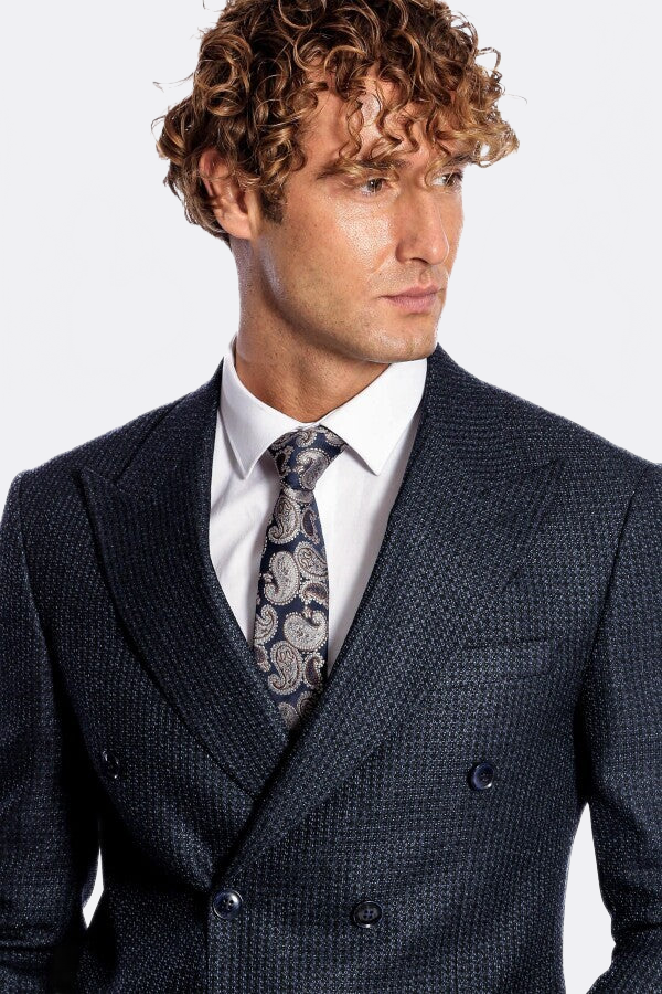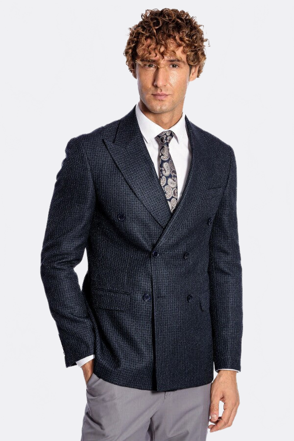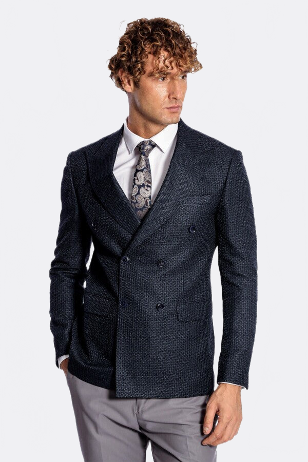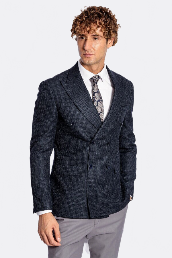Houndstooth Patterned Navy Blue Men Double Breasted Blazer - Wessi