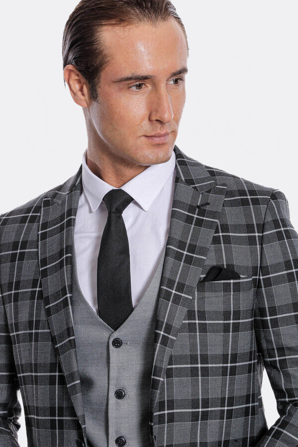 Are you looking to spruce up your business casual look? Well, we've got just the thing for you! This slim fit, peak lapel, black suit with a grey vest and a checked blazer. This combination is perfect for the office, special occasions, and business meetings. To complete your look, we suggest pairing this outfit with a crisp white shirt and a sleek tie. Opt for a simple pocket square to add a touch of elegance without going overboard. As for shoes, a classic black or brown leather dress shoe will do the trick. This outfit is versatile and can be dressed up or down depending on the occasion. Wear it to a business meeting or daily work attire, or style it up for special occasions like weddings or evening events. Either way, you'll be sure to turn heads with this stylish look.