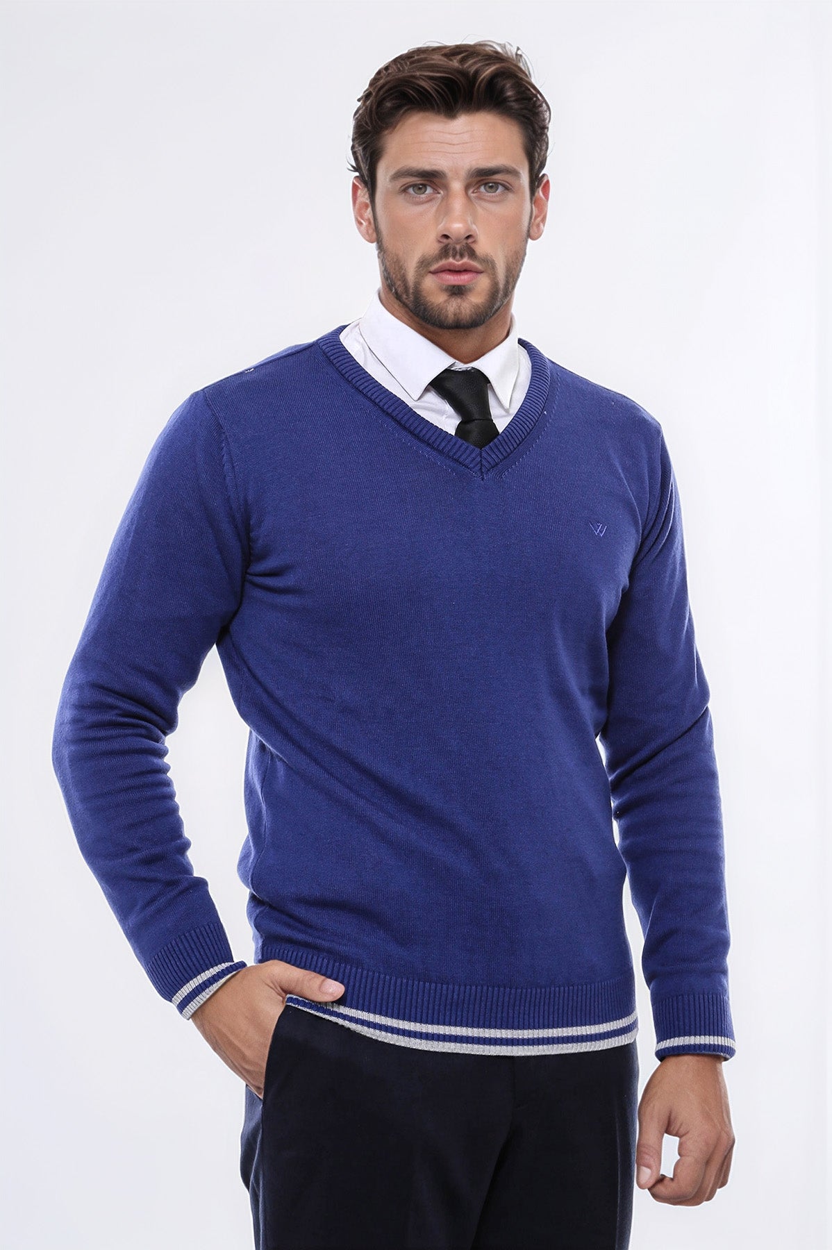 Dark Blue V Neck Slim Fit Sweater - Wessi