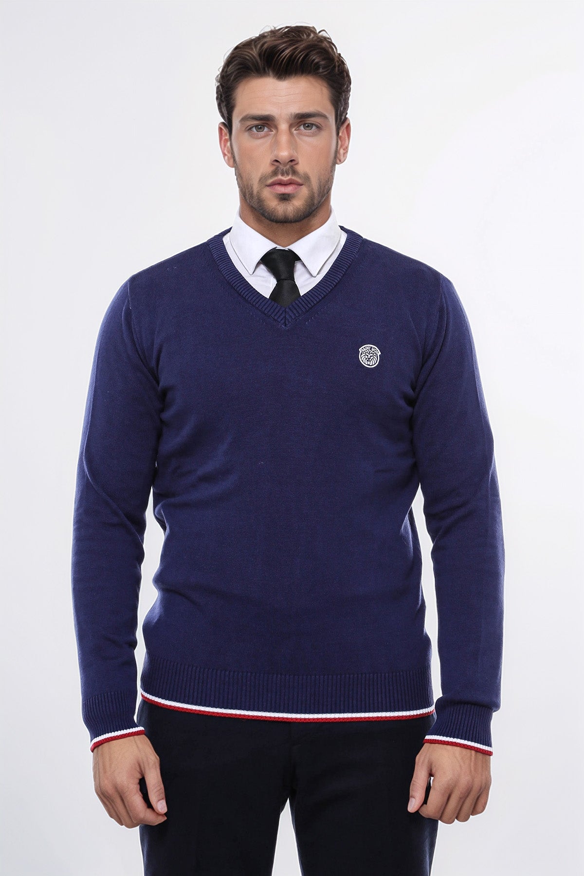 Navy Blue V Neck Slim Fit Men Sweater - Wessi