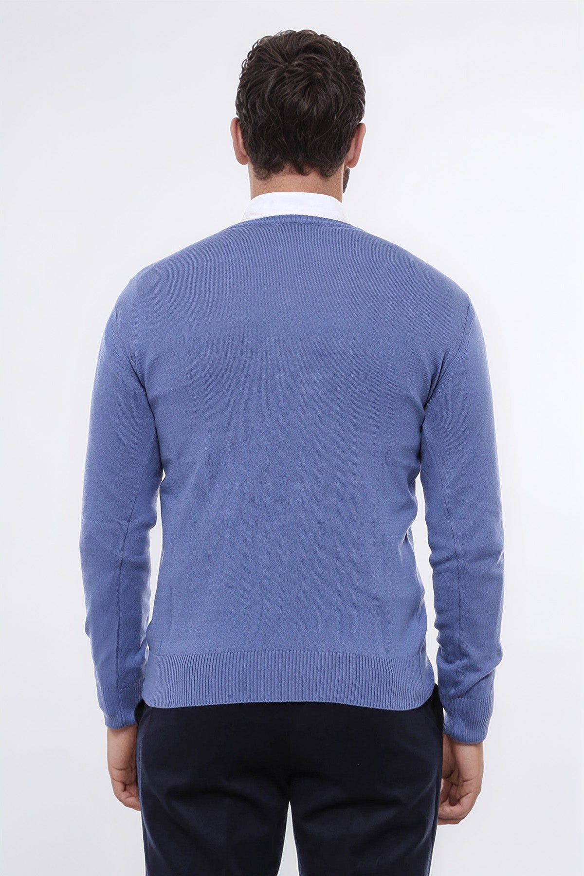 Q: In which season can this wholesale light blue V-neck sweater be worn?