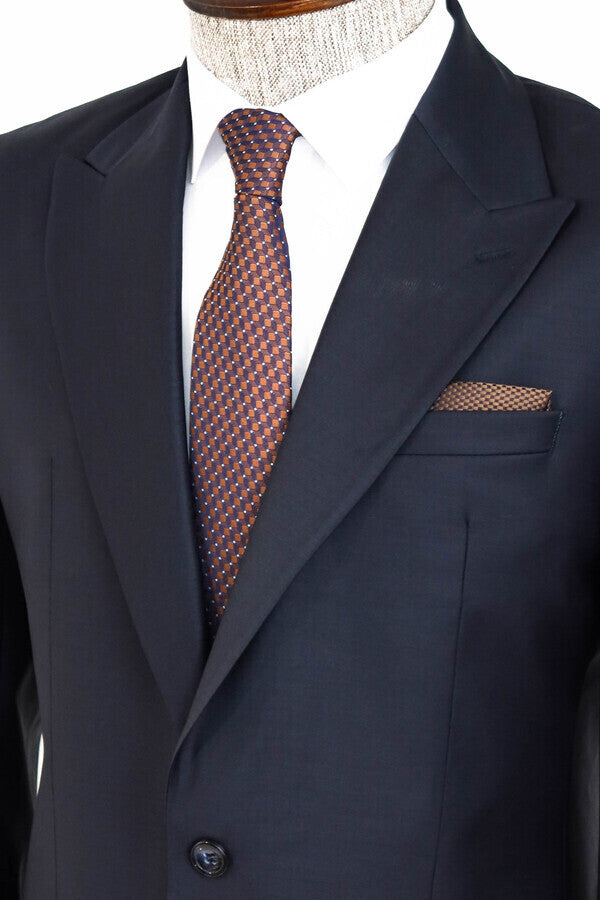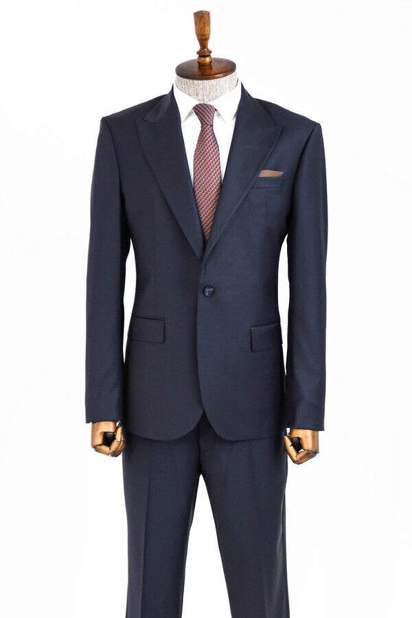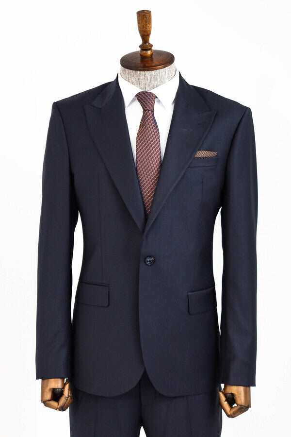 If you're on the hunt for a versatile and dapper suit, look no further than the slim fit, peak lapel, single button, navy blue two-piece men's suit made from high quality wool. This suit is perfect for any occasion, from office meetings to date nights and evening events. Try pairing your navy blue suit with a checked beige shirt and brown leather shoes. This bold look is perfect for evening events and dates, and it's sure to turn heads. So don't hesitate to invest in this timeless piece for your wardrobe. You'll be ready for any event, whether it's a night out on the town, a business meeting or a romantic date. Just remember to wear it with confidence and a smile, and you're sure to make a lasting impression.