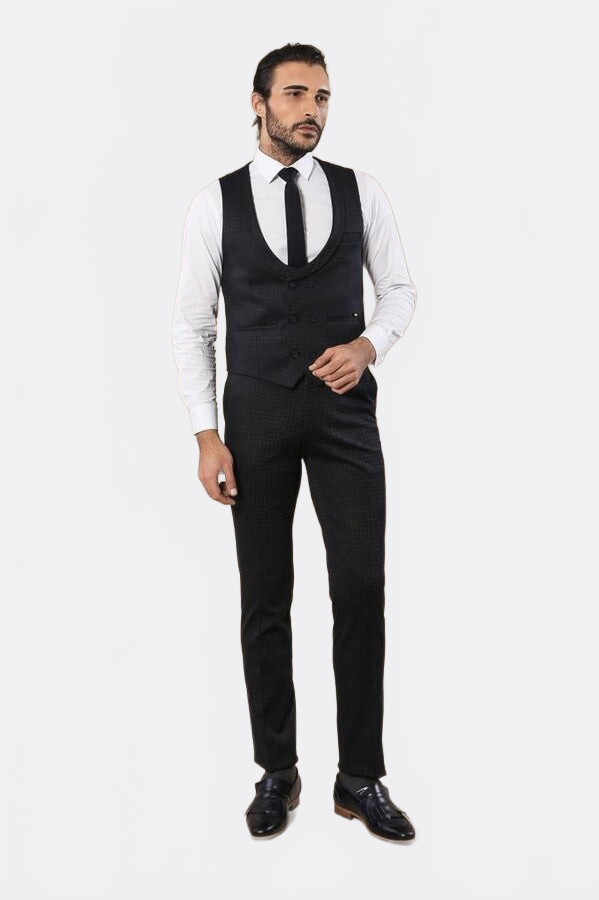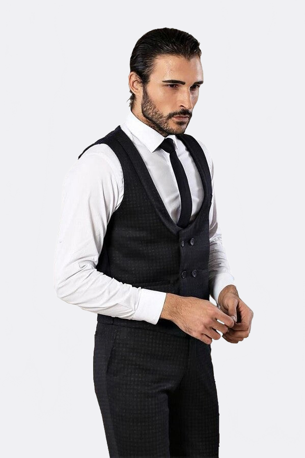 Patterned Double Breasted Navy Blue Men Trousers Vest Set - Wessi