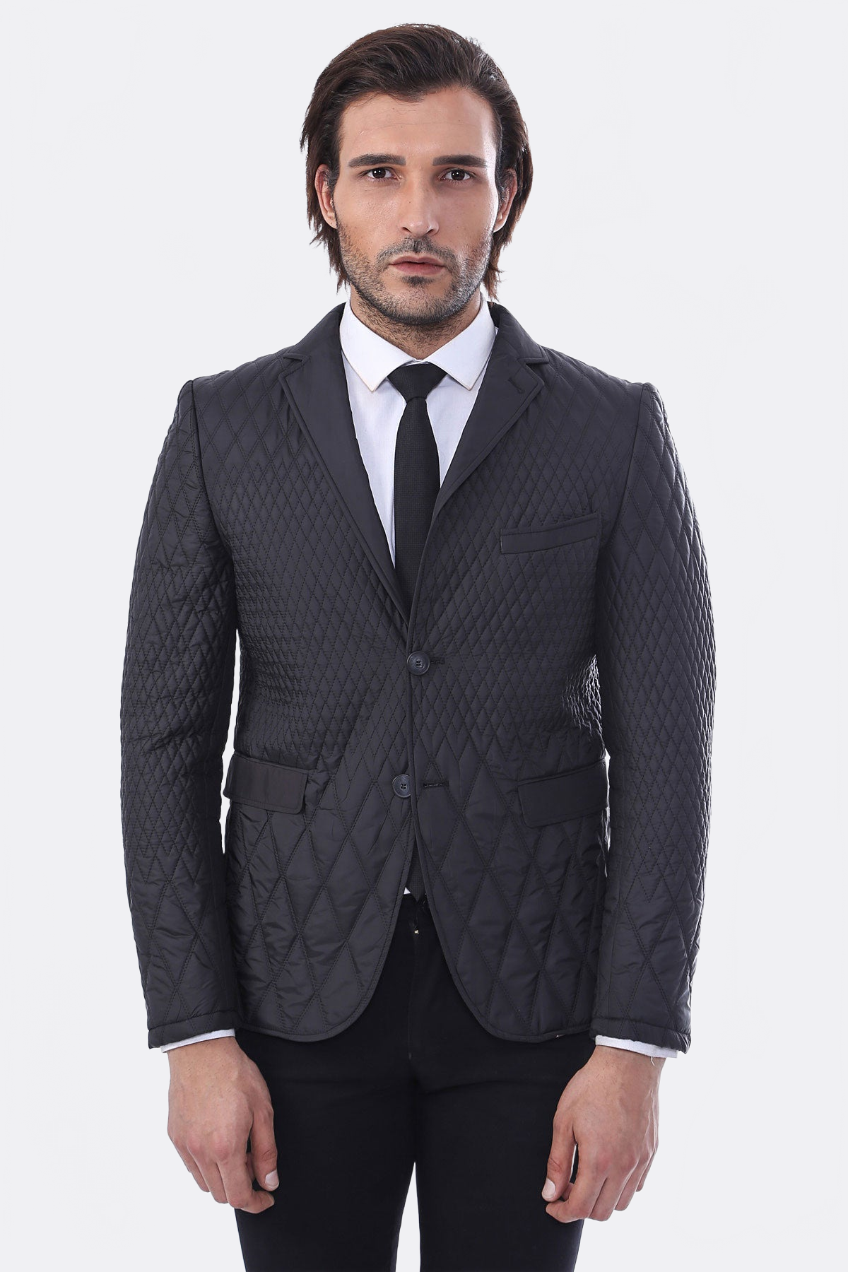 3 Pockets 2 Button Quilted Coat Jacket Black Short Coat-Wessi