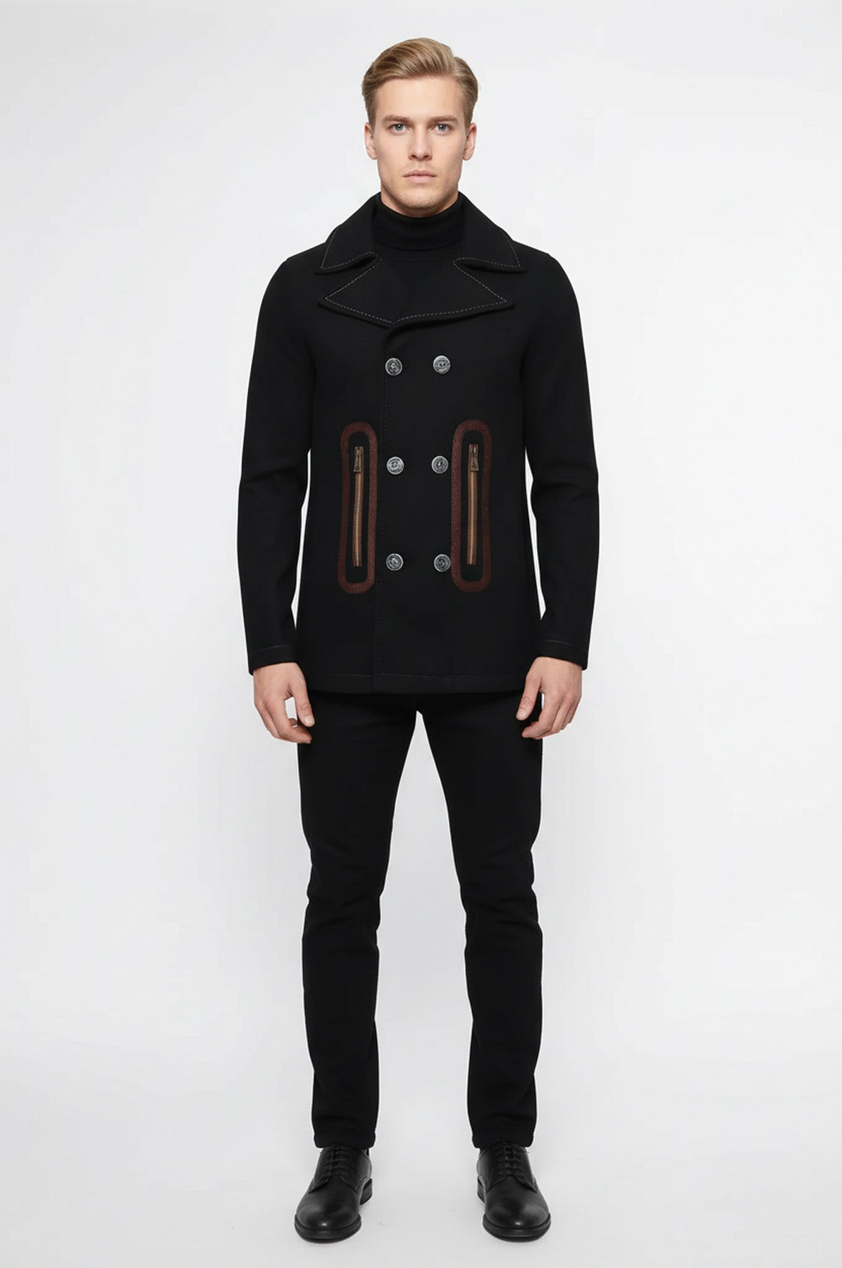Pocket Edge Embroidered 6 Buttons Brown Coat-Wessi