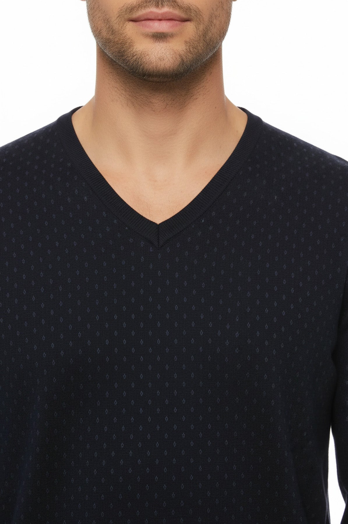 V neck mens sweater, designed dot patterned on chest in navy blue.