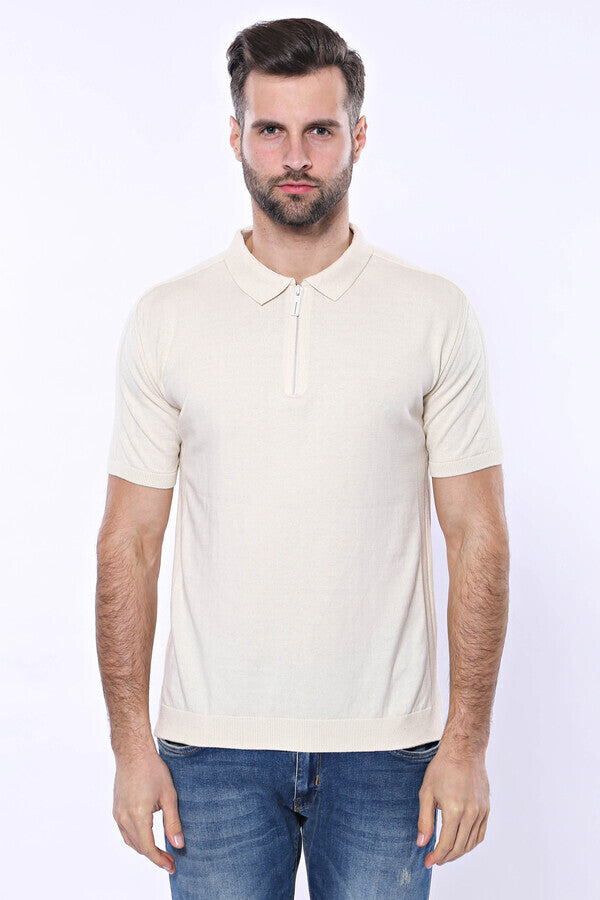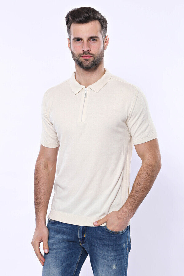 Las prendas de color crema se encuentran entre las opciones más ideales para los meses de verano. El modelo de camiseta de punto liso de color crema con cuello de polo también puede ser el preferido entre las combinaciones más cómodas de primavera y verano. Este modelo, que puedes usar fácilmente en tus conceptos diarios, se puede usar con jeans o pantalones de lino. El tejido de punto ofrece usos más drapeados. Permite que los caballeros de diferentes tamaños corporales lo usen de manera armoniosa y con estilo. Si bien el detalle de la cremallera es útil, los diseños elásticos en los brazos y la punta hacen que el modelo se vea más elegante en ti. Puedes elegir nuestro sitio para los conceptos más elegantes en todas tus búsquedas de combinaciones, y puedes marcar la diferencia en tu estilo con la calidad de wessi comprando a precios reducidos cada temporada.