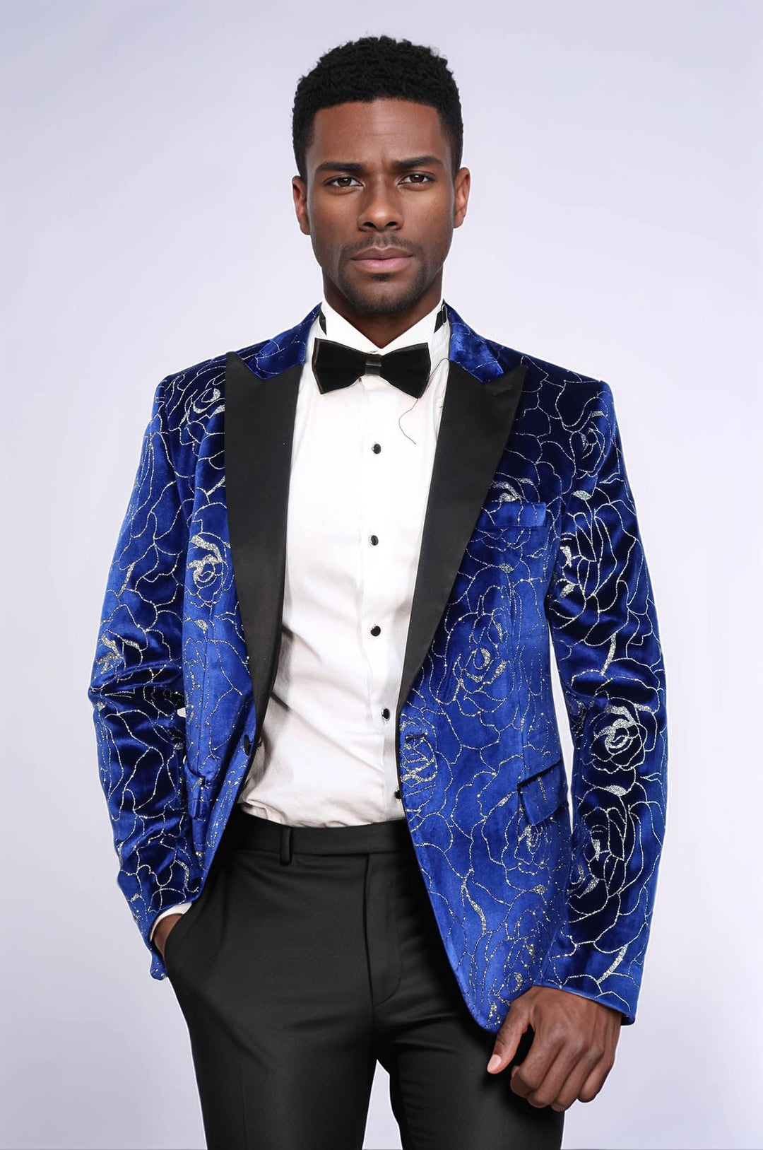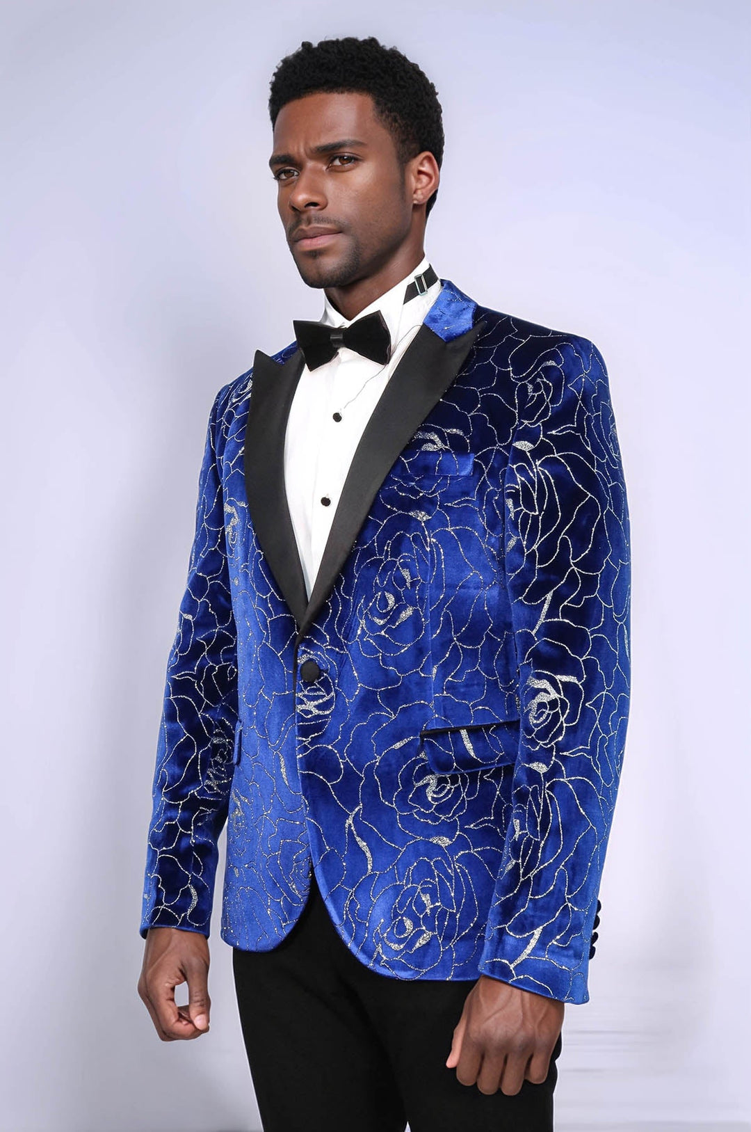 Blazer de fiesta para hombre con estampado de rosas plateadas sobre azul - Wessi