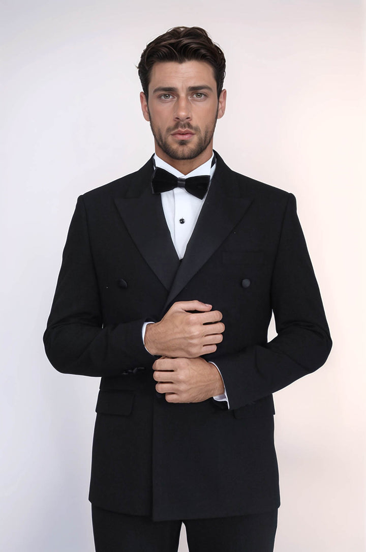 Timeless elegance meets contemporary tailoring with the Slim Fit Double-Breasted Black Tuxedo Suit with Satin Lapel – Wessi. Designed for men who demand sophistication and sharp style, this tuxedo is the perfect choice for weddings, black-tie events, galas, and all formal occasions.