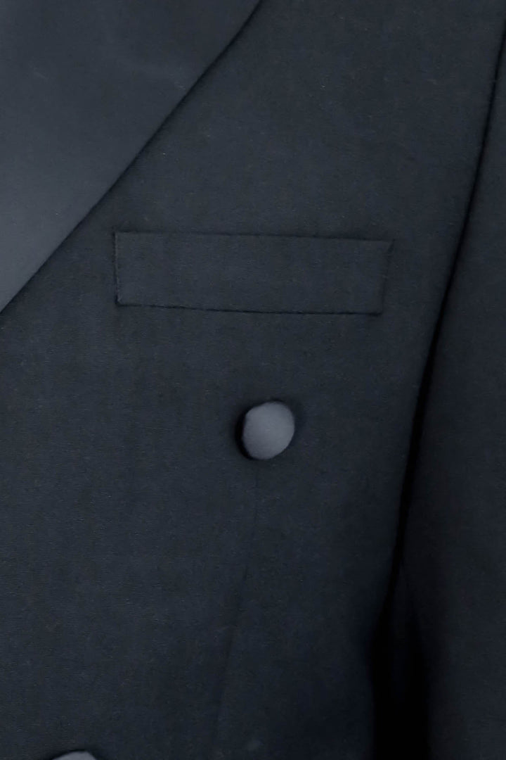 Featuring a double-breasted front for a bold and masculine silhouette, the jacket is elevated with sleek satin peak lapels that add a refined shine. The slim fit cut contours the body for a tailored and modern look, while the matte black buttons complete the ensemble with understated elegance.