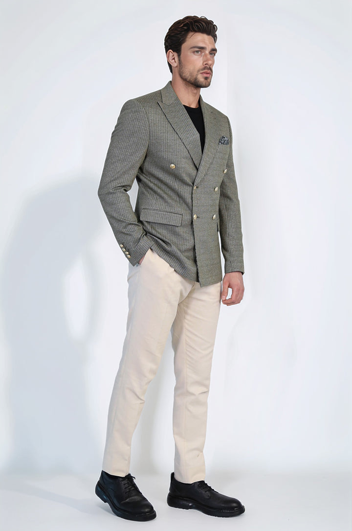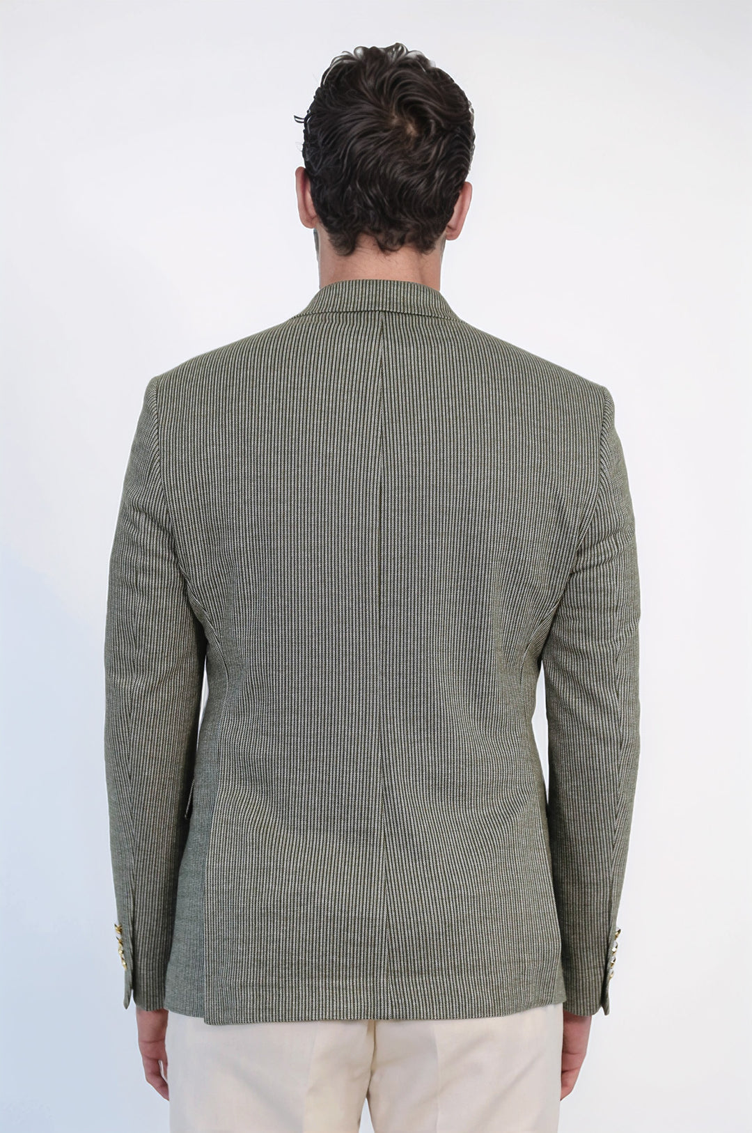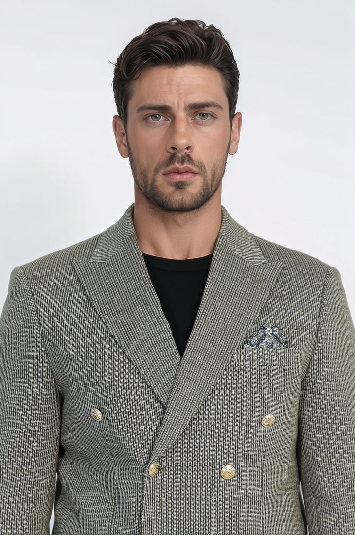 Olive Green Pinstriped Slim Fit Double-Breasted Blazer with Gold Metal Buttons – Wessi