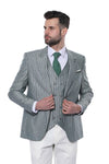 Este traje verde consta de tres piezas. La chaqueta de rayas verdes y blancas tiene un solo botón. La chaqueta de cuello en punta tiene dos botones. Es un modelo de chaleco cruzado con estampado de rayas verdes y blancas en el interior. El chaleco de este traje muy elegante también está diseñado con cuello en punta. Se combina con pantalones rectos de color blanco. Las chaquetas, chalecos y pantalones están confeccionados con un molde de corte ajustado.