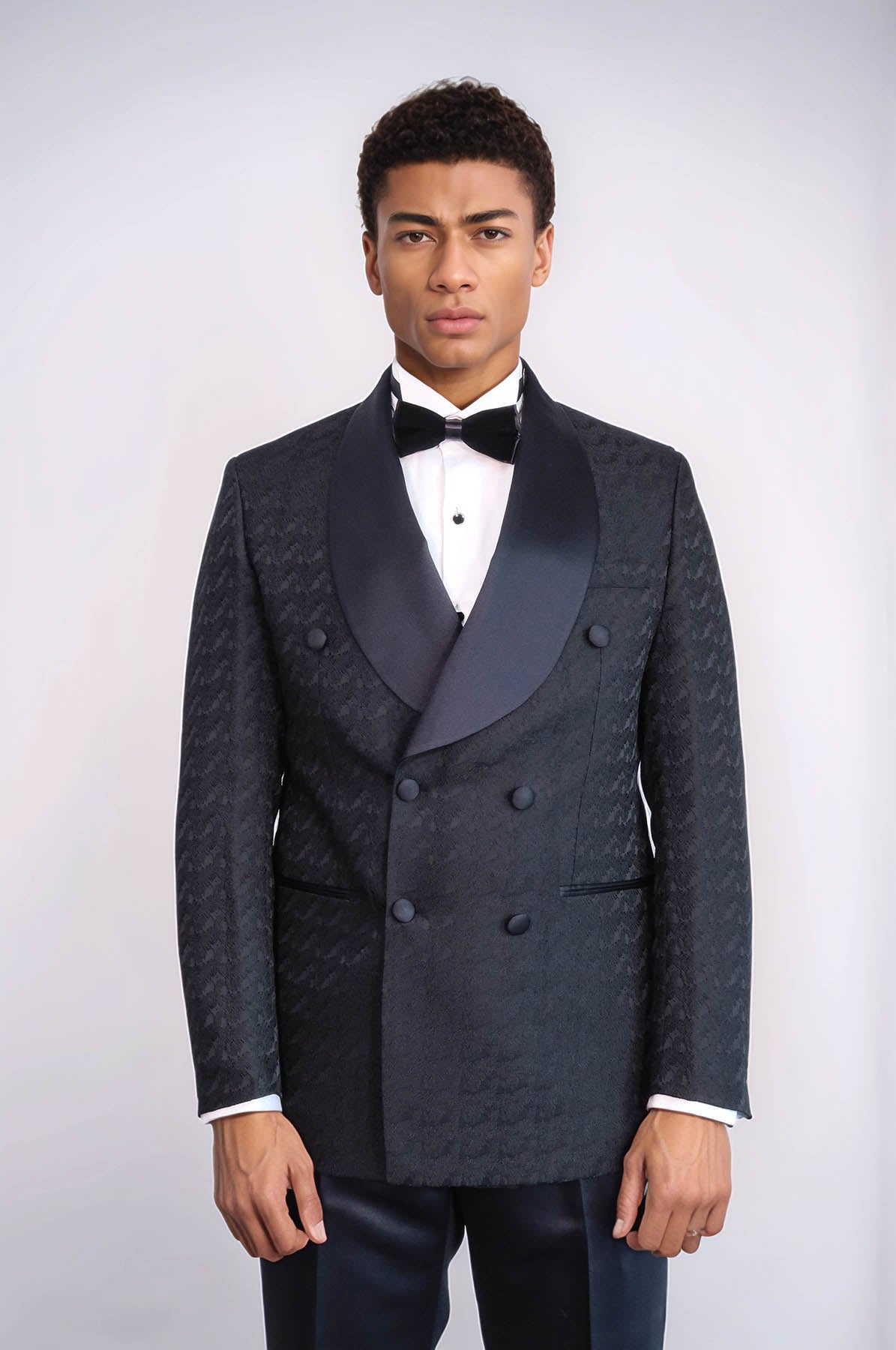 A: The suit features a rich black jacquard fabric with a subtle woven texture, satin shawl lapel, and a double-breasted jacket paired with matching trousers for a complete premium look.