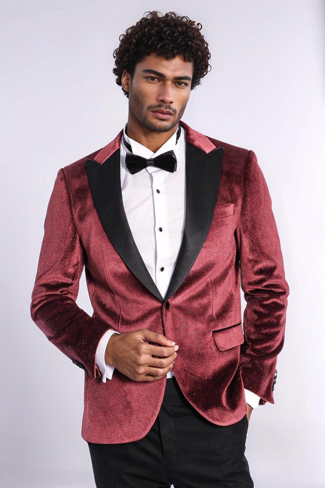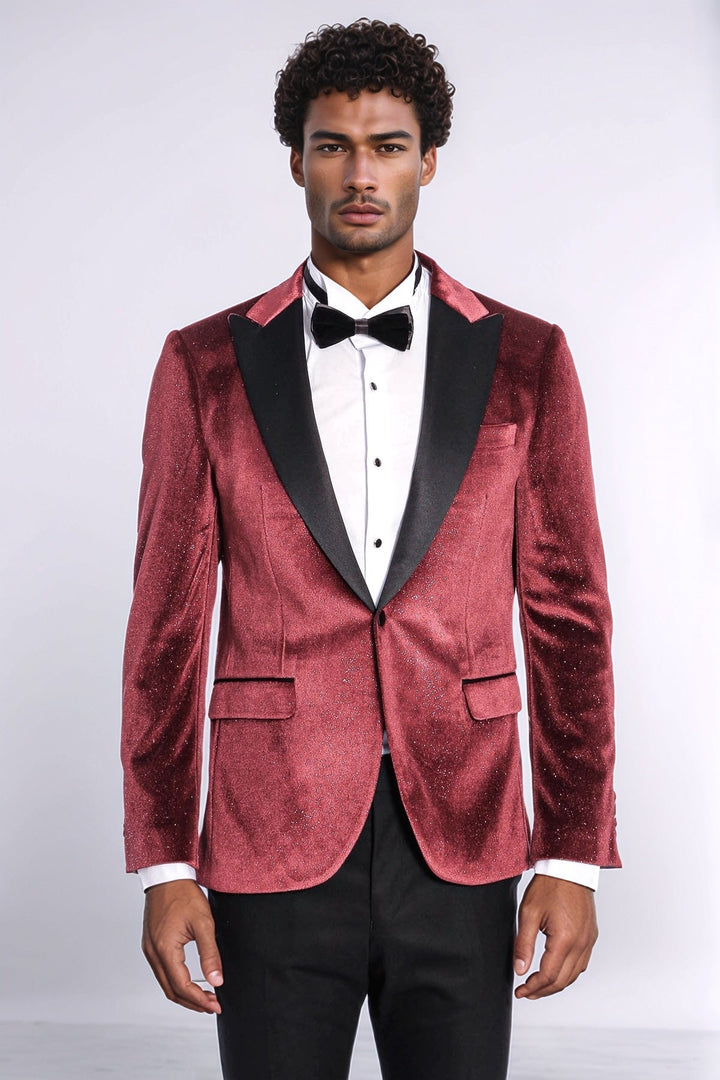 Blazer de fiesta para hombre de terciopelo burdeos ajustado y brillante - Wessi