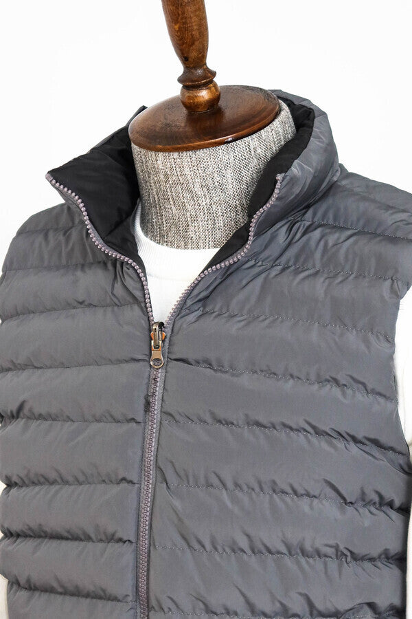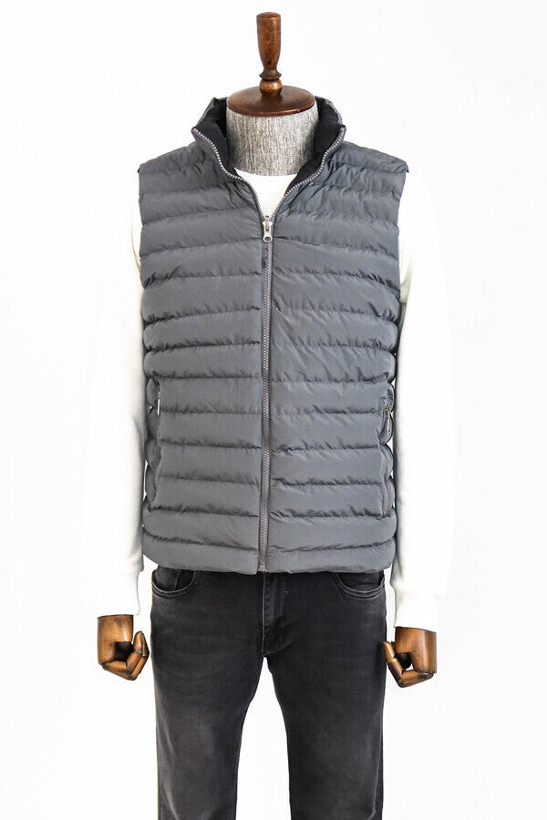 Los chalecos de invierno para hombre son la prenda perfecta para mantenerte abrigado y complementar tu estilo en condiciones climáticas frías. Estos chalecos están equipados con materiales aislantes de alta calidad y ofrecen protección contra los vientos fríos. Una opción práctica y elegante, este chaleco de invierno gris para hombre cuenta con dos bolsillos, cierre de cremallera, cuello alto y costuras acolchadas. También es un producto versátil con su característica de dos lados. Ofrece un estilo deportivo a la vez que te mantiene abrigado y cómodo contra las condiciones climáticas frías. Puedes combinar este chaleco de invierno gris con una sudadera deportiva negra o azul marino para un look casual y deportivo. Puedes elegir un par de jeans negros o grises de corte deportivo debajo. Puedes enfatizar tu estilo usando zapatillas blancas o deportivas como zapatos. Además, no olvides agregar un sombrero deportivo y gafas de sol. Este atuendo es ideal para pasar tiempo con amigos, asistir a eventos deportivos o para un fin de semana relajado.