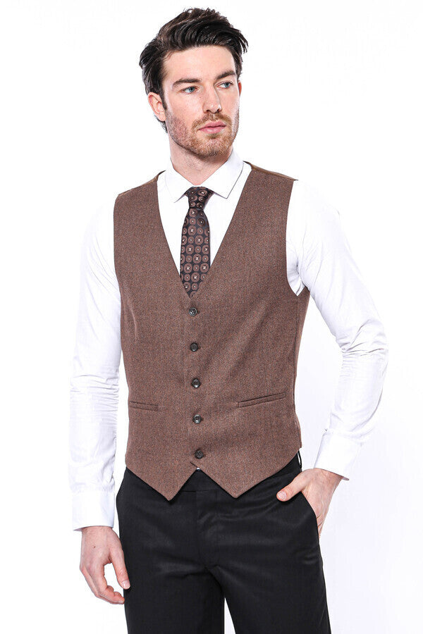 Mejora tu guardarropa con nuestro chaleco de hombre con cuello en V en color tostado de Wessi. Fabricado con materiales de alta calidad, disfruta del equilibrio perfecto entre estilo y comodidad. El diseño con cuello en V agrega un toque de elegancia, perfecto para cualquier ocasión formal. Prepárate para llamar la atención y hacer una declaración.
