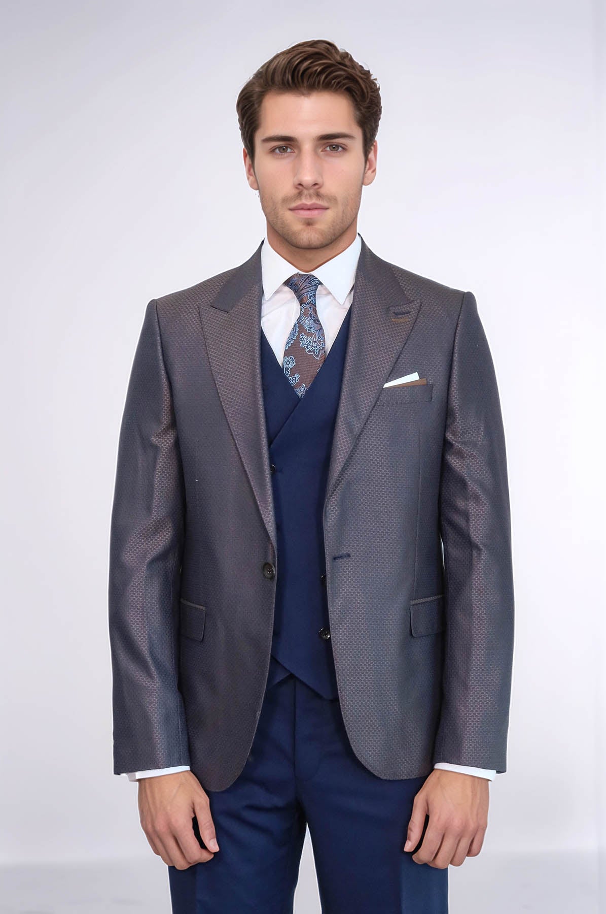 Traje de hombre azul marino y marrón con estampado - Wessi