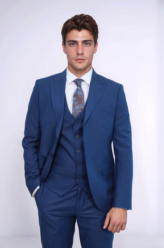 Blue Men's Plain Suit with Vest - Wessi