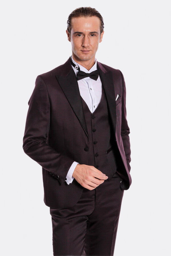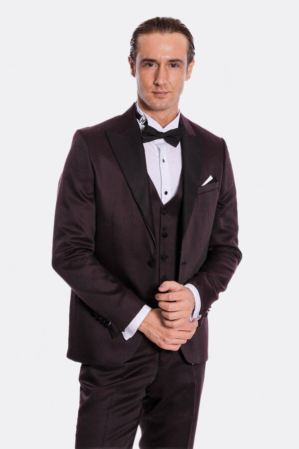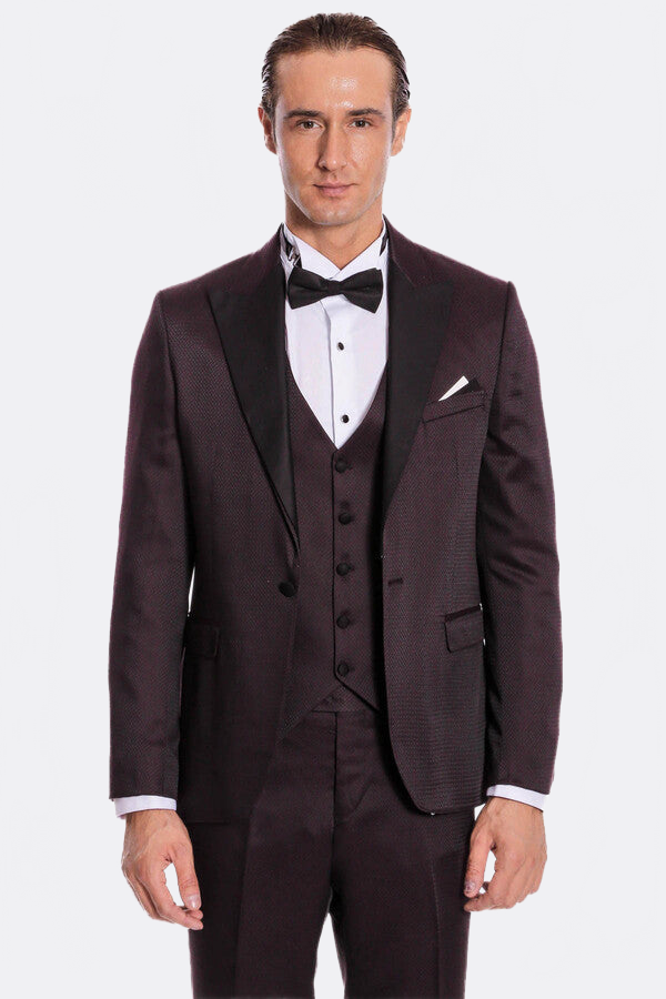 The suit model, produced with bright black colored polyvison fabric, offers a very nice look. It is a groom suit model decorated with dotted pattern consisting of pants, vest and jacket. It has three pockets and two slits. It has a wide pointed collar. It has a very elegant vest with a V-neck dot pattern. Vest and jacket models with slim fit pattern will suit you well. It is a dotted pattern, black color and slim fit trousers.