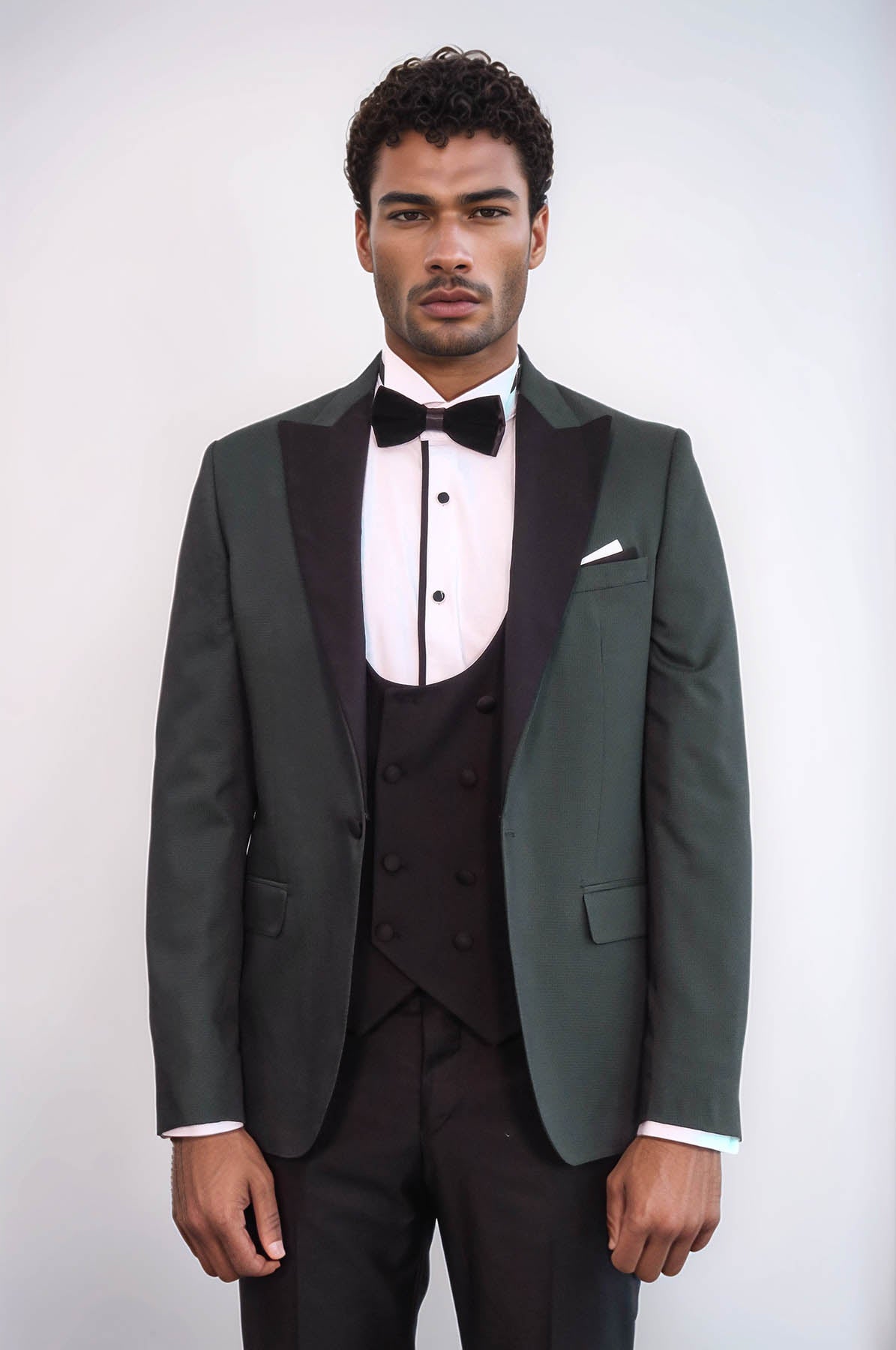 A: The tuxedo features a deep green fabric with a black satin shawl lapel and a matching double-breasted vest, blending elegance with modern flair.