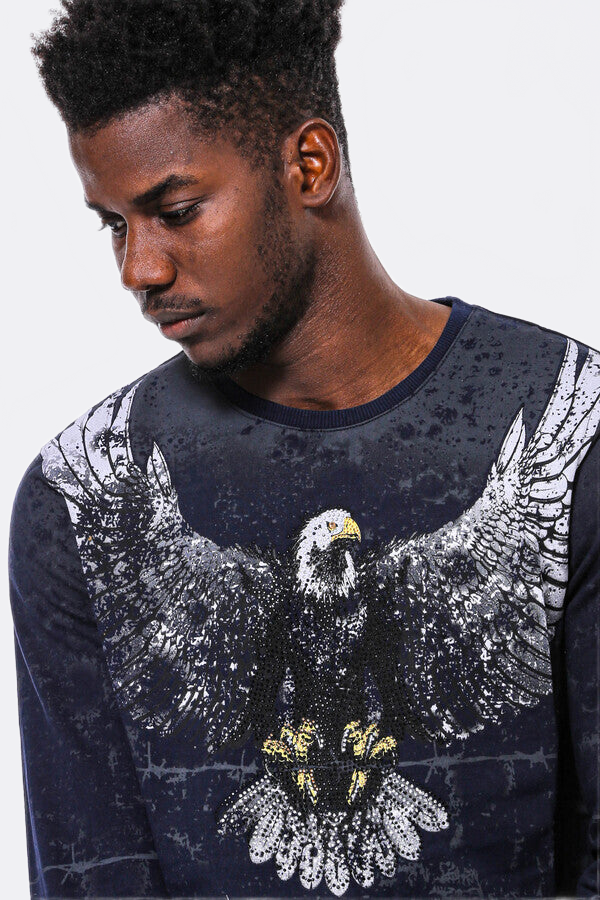 Eagle Patterned Slim Fit Navy Blue Sweatshirt - Wessi