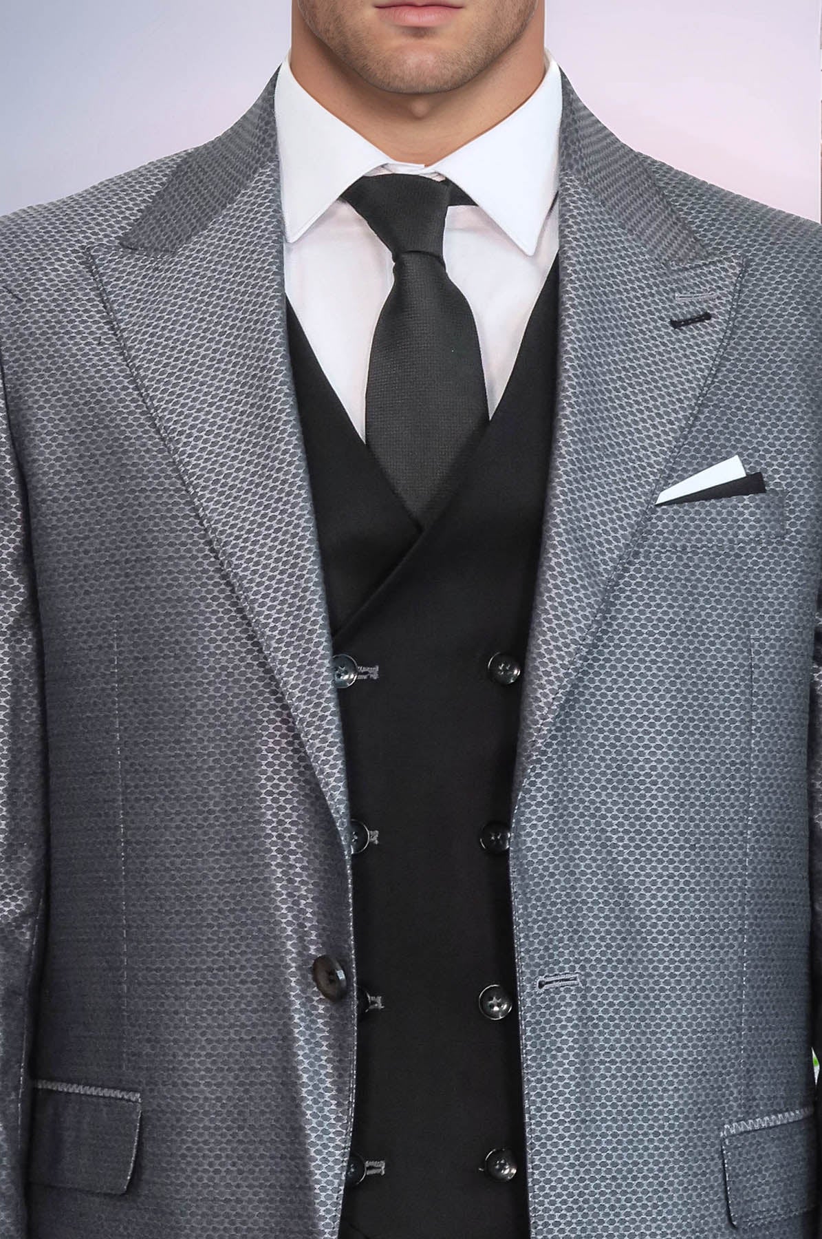 A: The package includes a grey patterned blazer and slim trousers. It can be paired with a black vest for a complete 3-piece style.