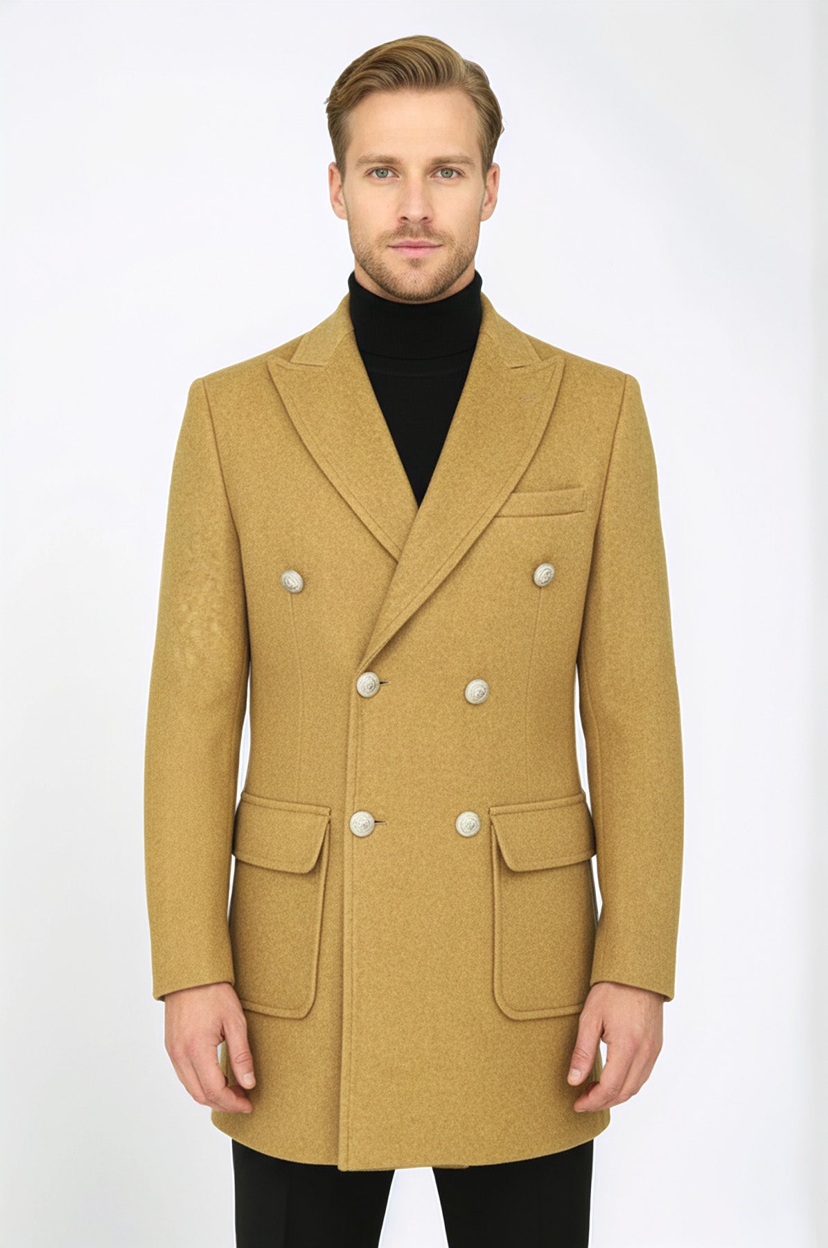 Wool coats are considered classic and timeless pieces in menswear. They are usually found in long cuts and help you complete any outfit. A special option for men who care about your elegance and warmth, this coat offers an extraordinary look with its tan color and wide pointed collar. The metal buttons and double-breasted design combine both functionality and modern style. The tan color makes it classic and sophisticated. Pair this tan coat with a gray or black sweater, dark jeans or canvas pants for a stylish and warm winter look. Adding black or brown leather boots will complete your style and protect your feet in cold weather. Order this coat now and elevate your winter style!