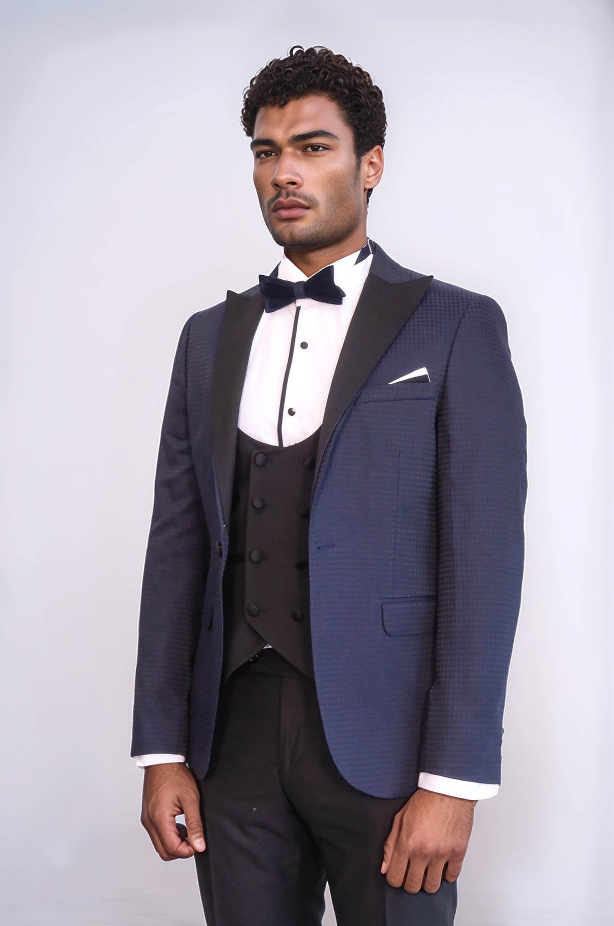 A: The tuxedo features a textured navy fabric, black satin peak lapels, and a double-breasted waistcoat, making it a premium option for bulk orders.