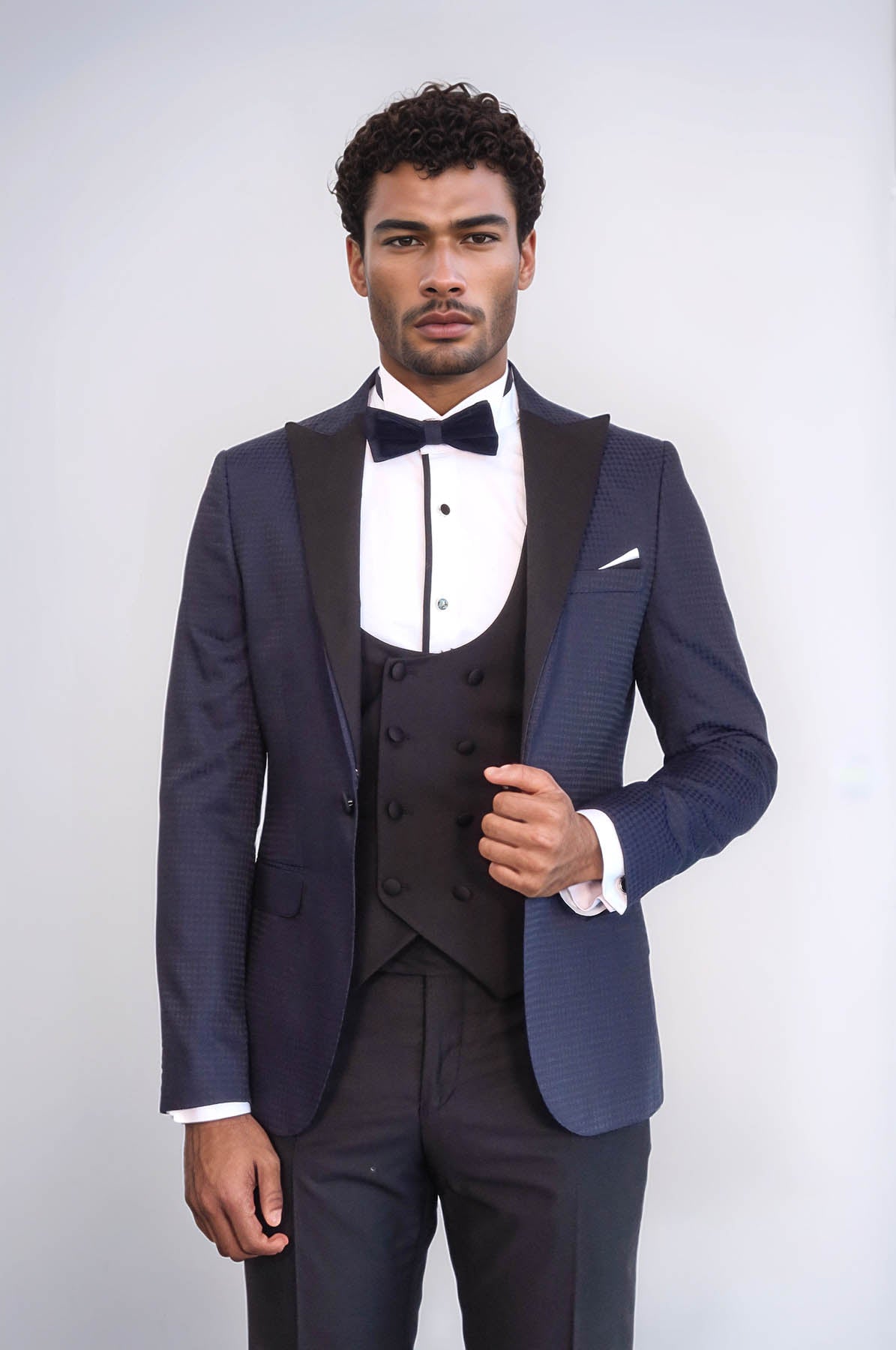 A: Yes. It looks refined with tuxedo trousers and a bow tie, but wholesale buyers can also style it with slim-fit pants or patterned ties for versatile retail displays.