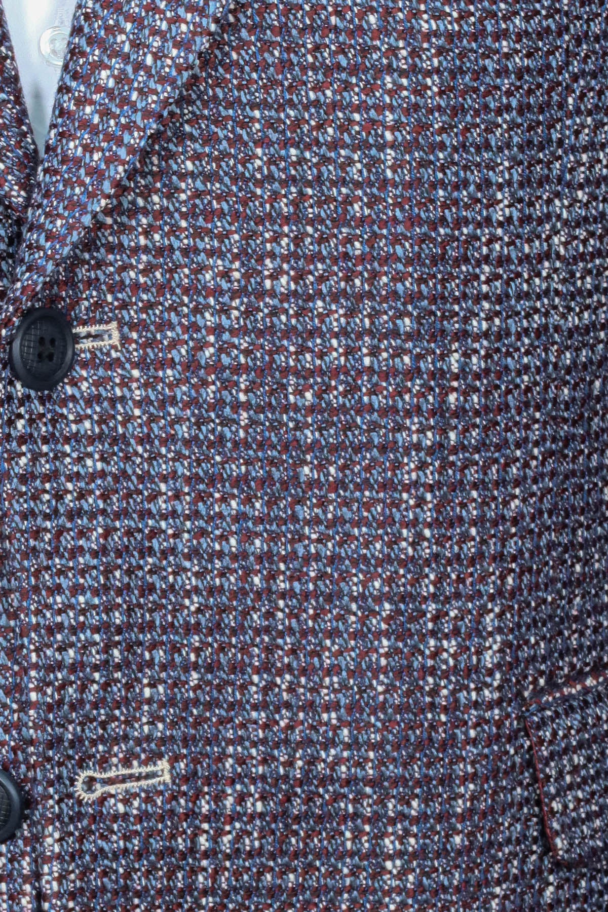 A: It features a multi-tone textured jacquard fabric in blue and subtle burgundy accents, giving it a rich and stylish look.