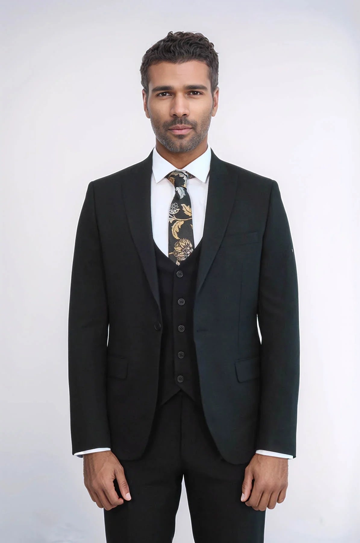 Üç Parça Dar Kesim Tek Düğmeli Siyah Erkek Takım Elbise