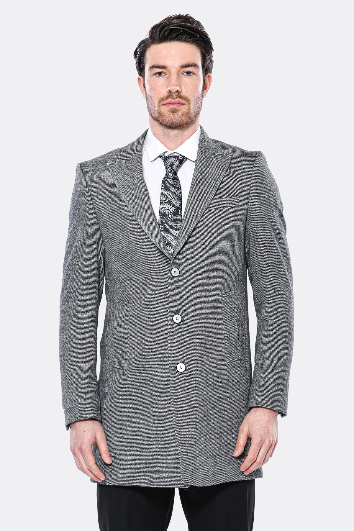 Cachet Peak Lapel Gri Erkek Uzun Palto - Wessi