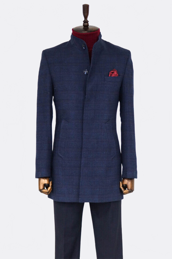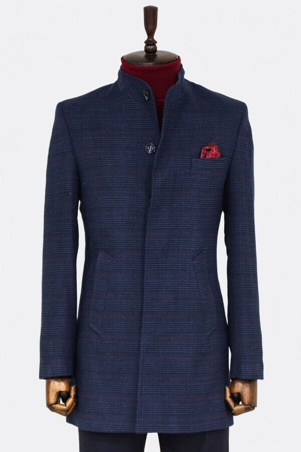 Dik Yaka Kareli Lacivert Erkek Ceket - Wessi