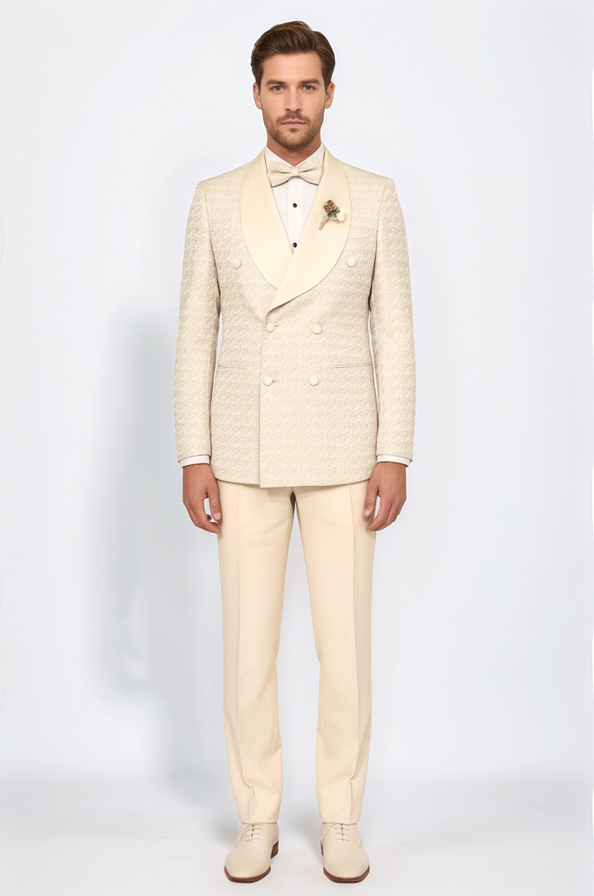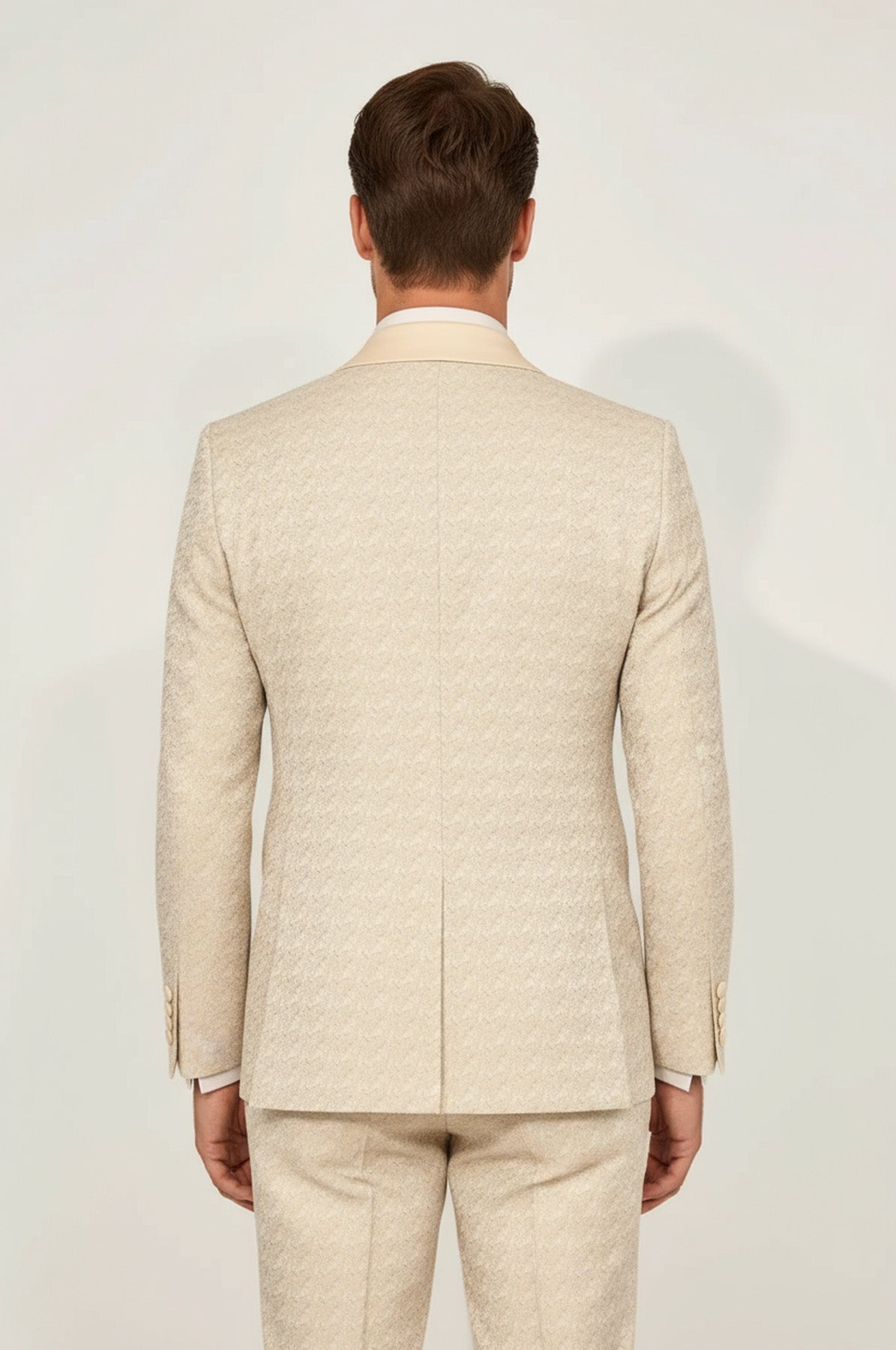 Saten Şal Yaka Desenli Çift Düğmeli Şampanya Erkek Tuxedo Takım Elbise - Wessi