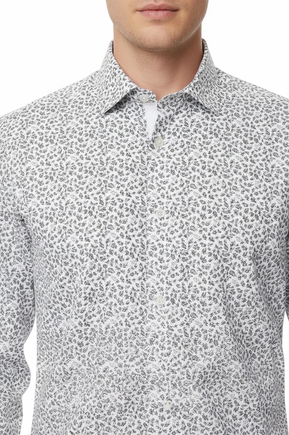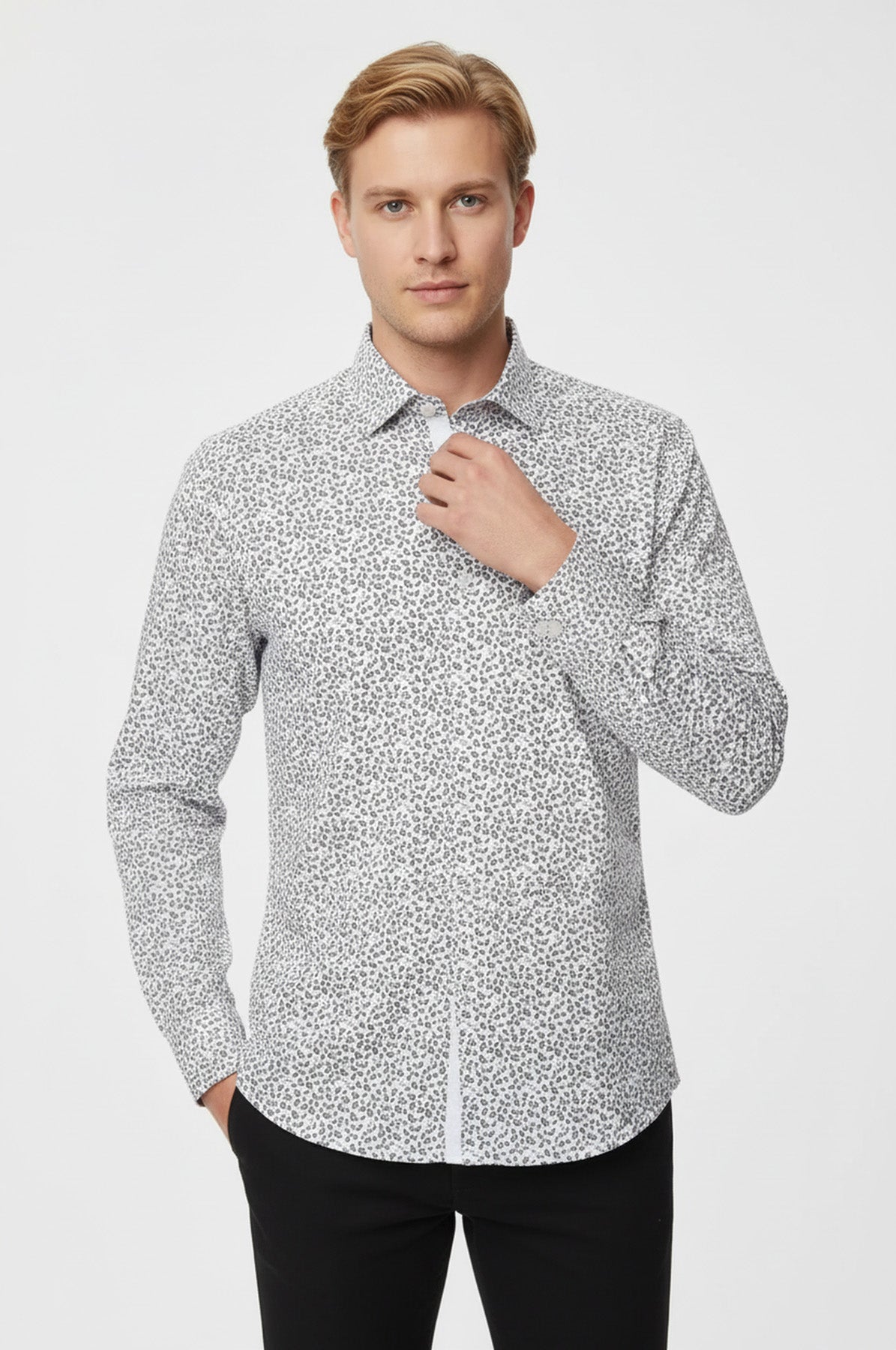 Cebisiz, dar kesim, uzun kollu, günlük erkek gömleği; lacivert ve beyaz renkte pamuklu nokta desenli kumaşla tasarlanmıştır. Bu spor erkek gömleği, pamuklu kumaştan yapılmıştır ve serinlerken terletmeyen bir kumaşa sahiptir. Küçük yaprak desenleriyle canlı ve renkli bir görünüm sunar. Bu beyaz gömlek, uzun kollu ve şık bir gömlektir. Cebin ve yakada düğmelerin olmadığı bu gömlek, dar kesim kalıbıyla üretilmiştir. Dar kesimiyle daha fit görünmenizi sağlar. Bu model spor gömlek olarak, her zaman şık bir spor görünüm elde etmenizi sağlar.