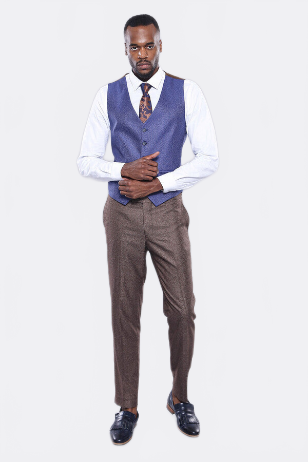 Ekose kahverengi ceket, mavi düz yelek ve kahverengi düz pantolondan oluşan 3 parçadan oluşan takım elbise modelidir.